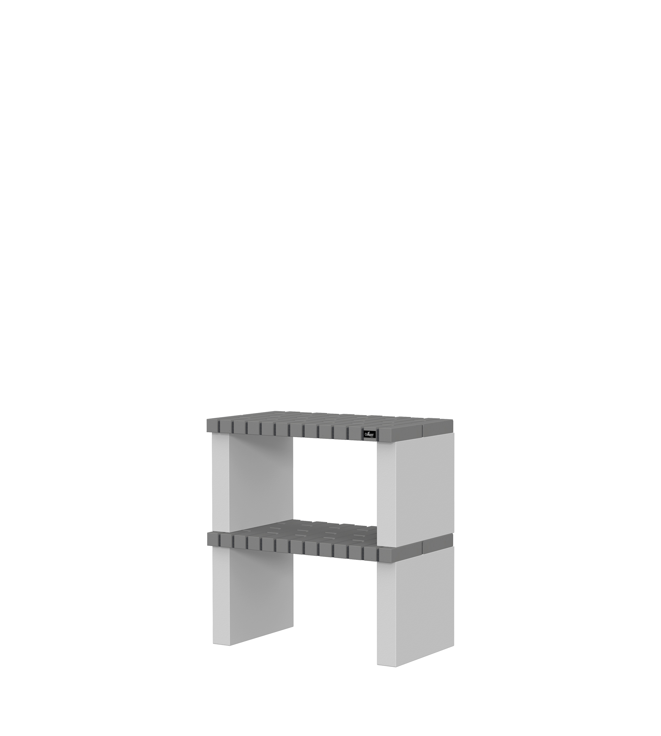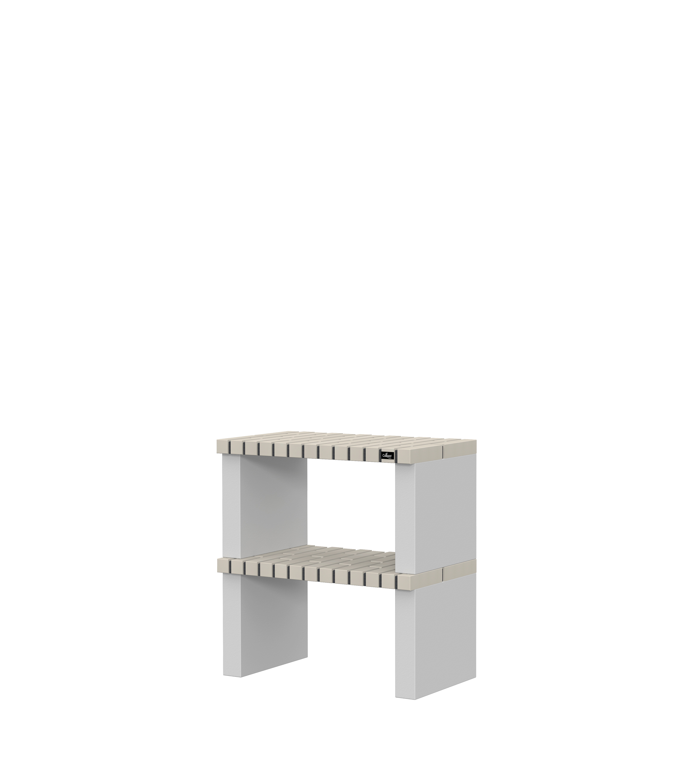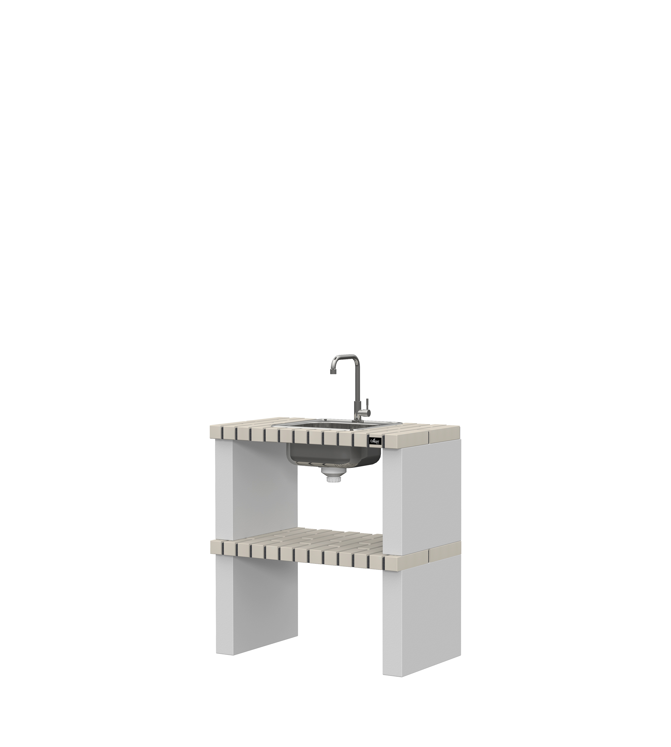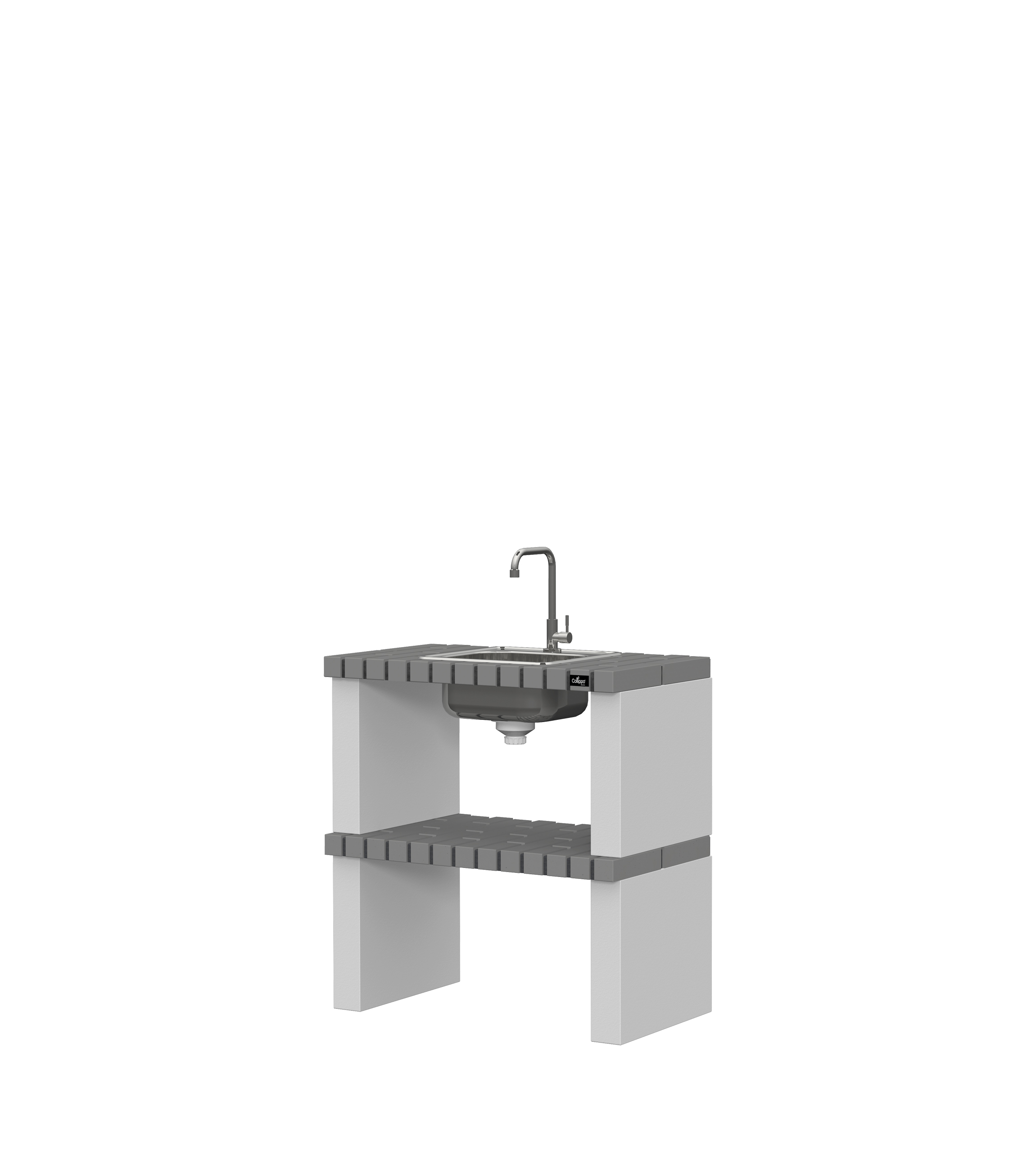 Micro betão texturado cinzento; bancadas em tijolo