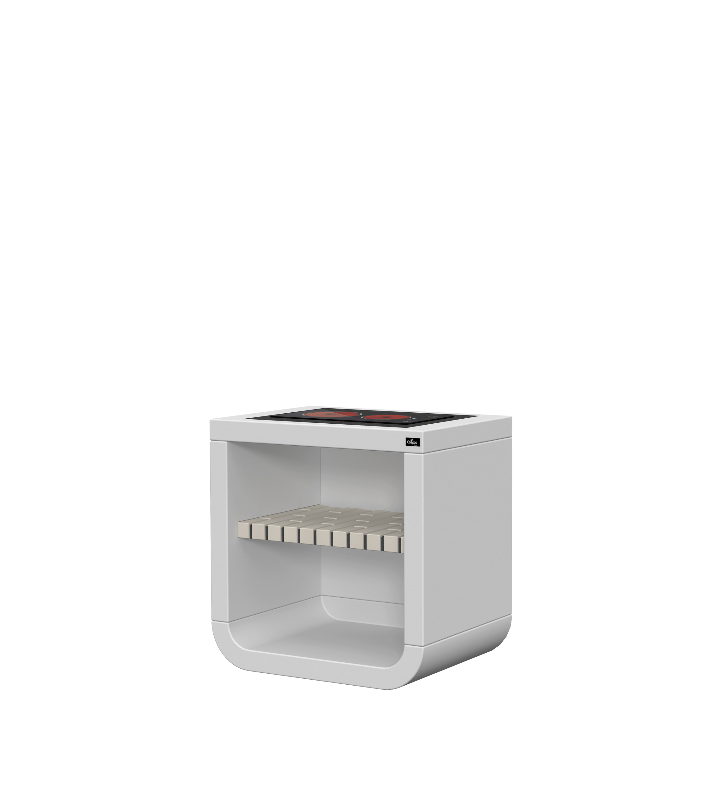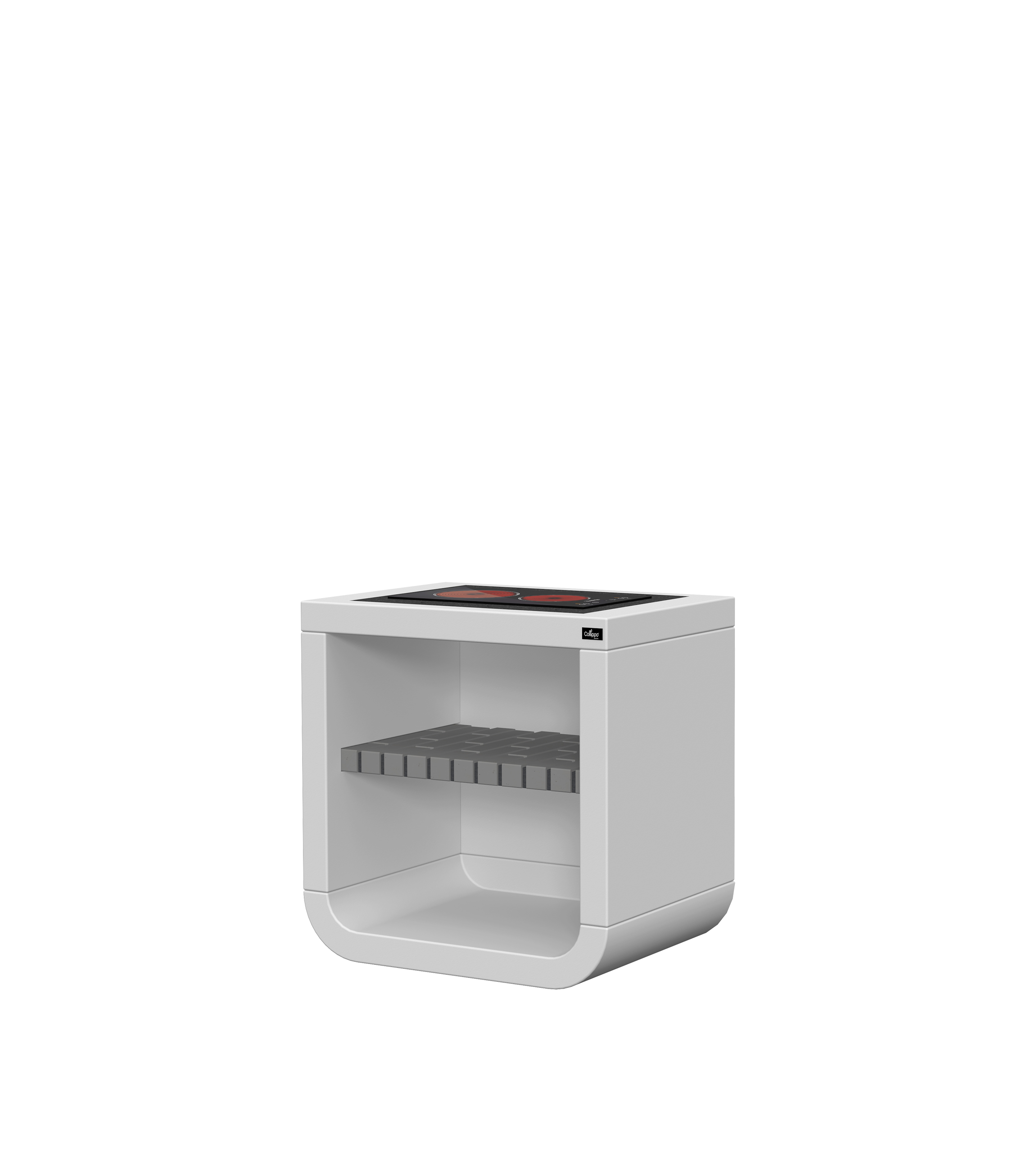 Micro betão liso branco; bancada em granito com placa eléctrica; prateleira em tijolo