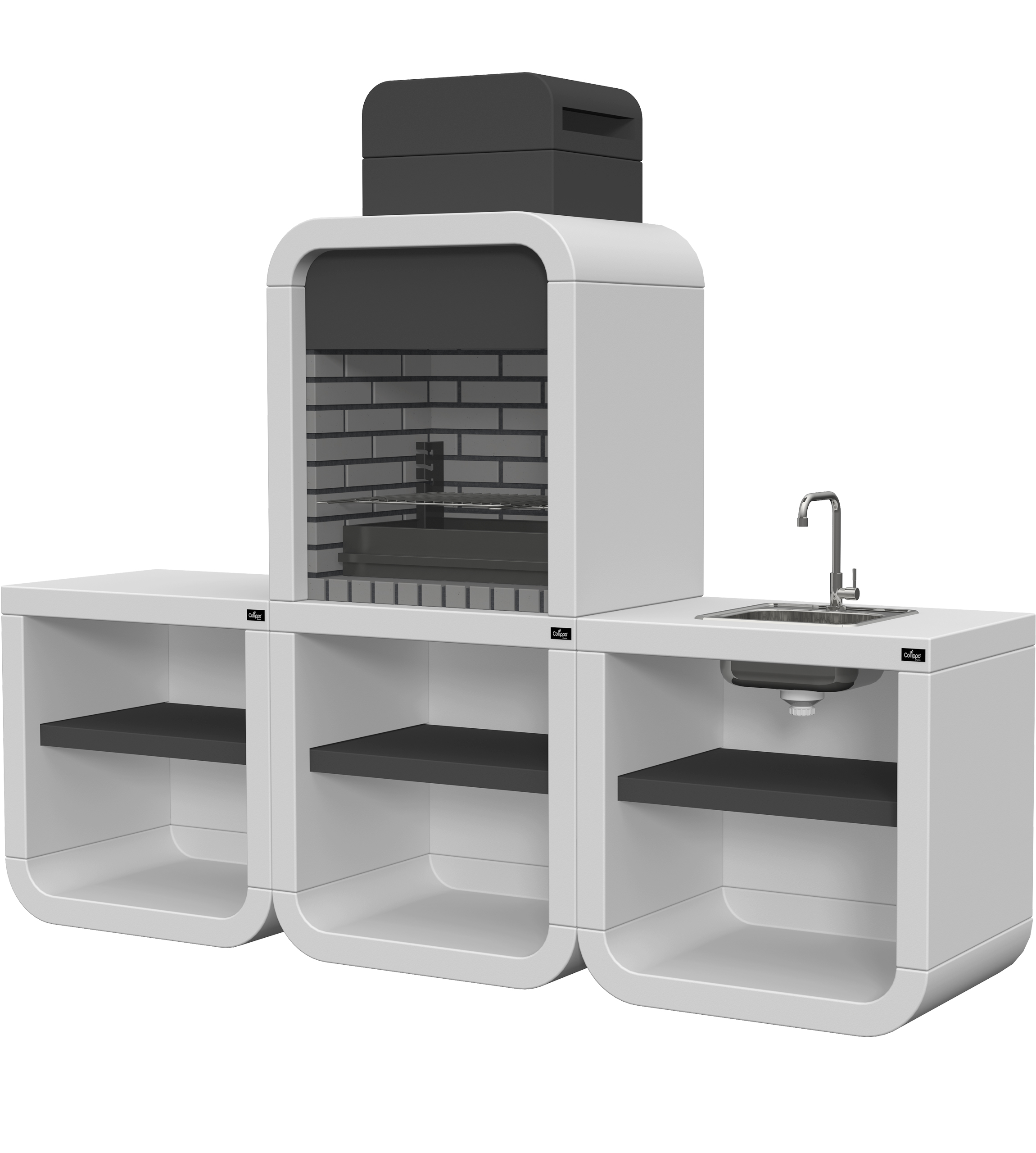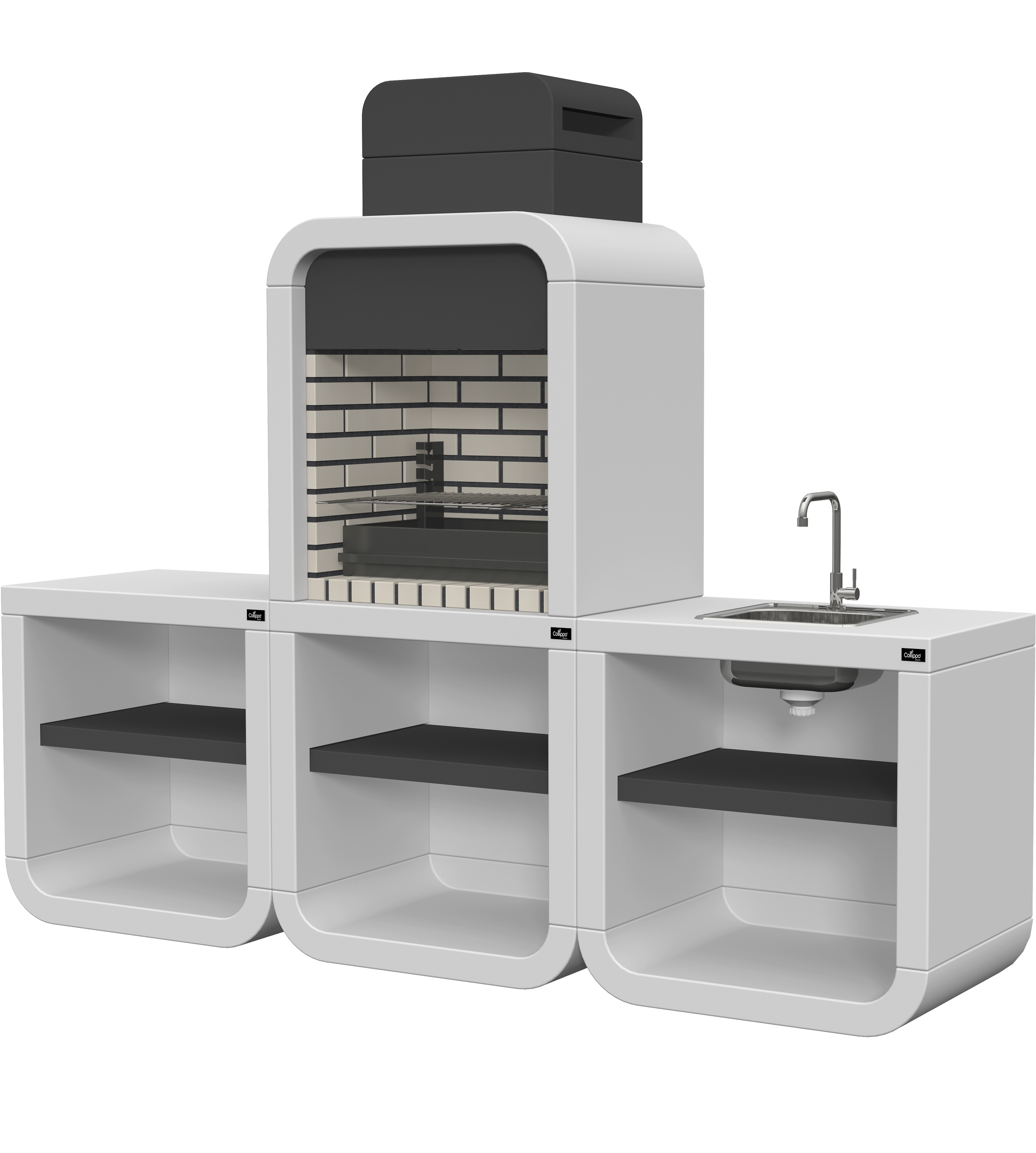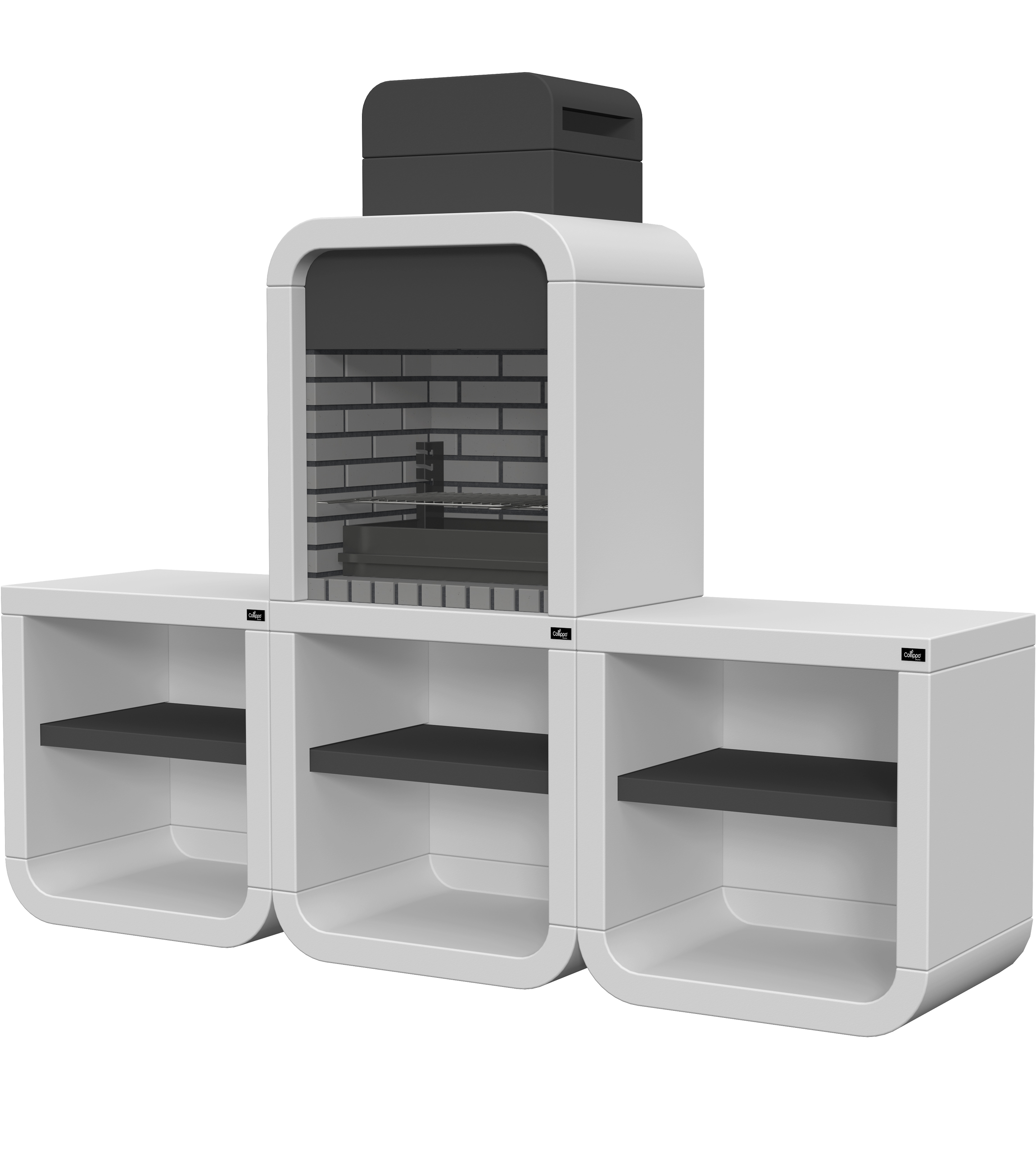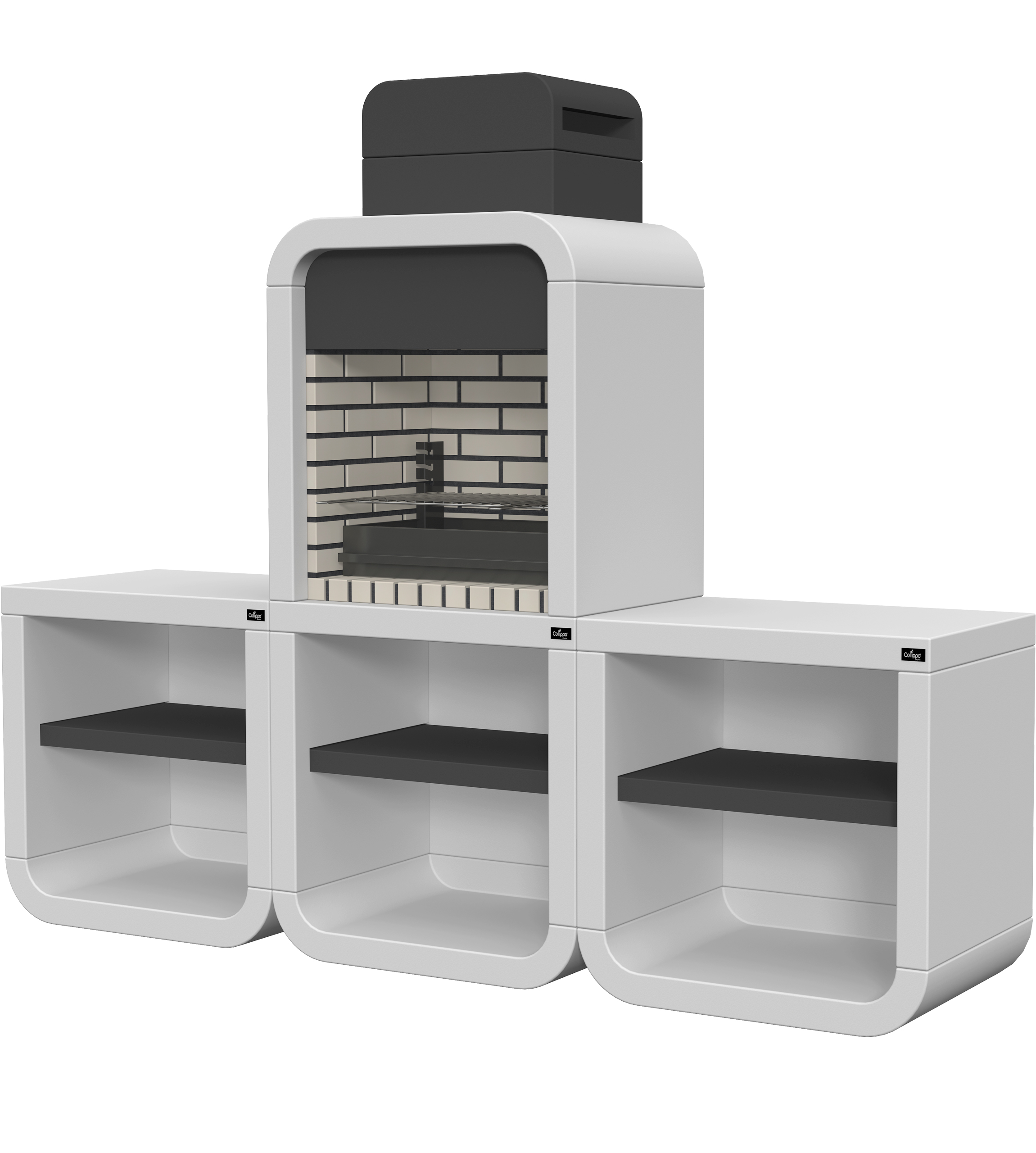 Micro betão liso branco; peças com pintura preta; zona de fogo em tijolo e cimento refractário.