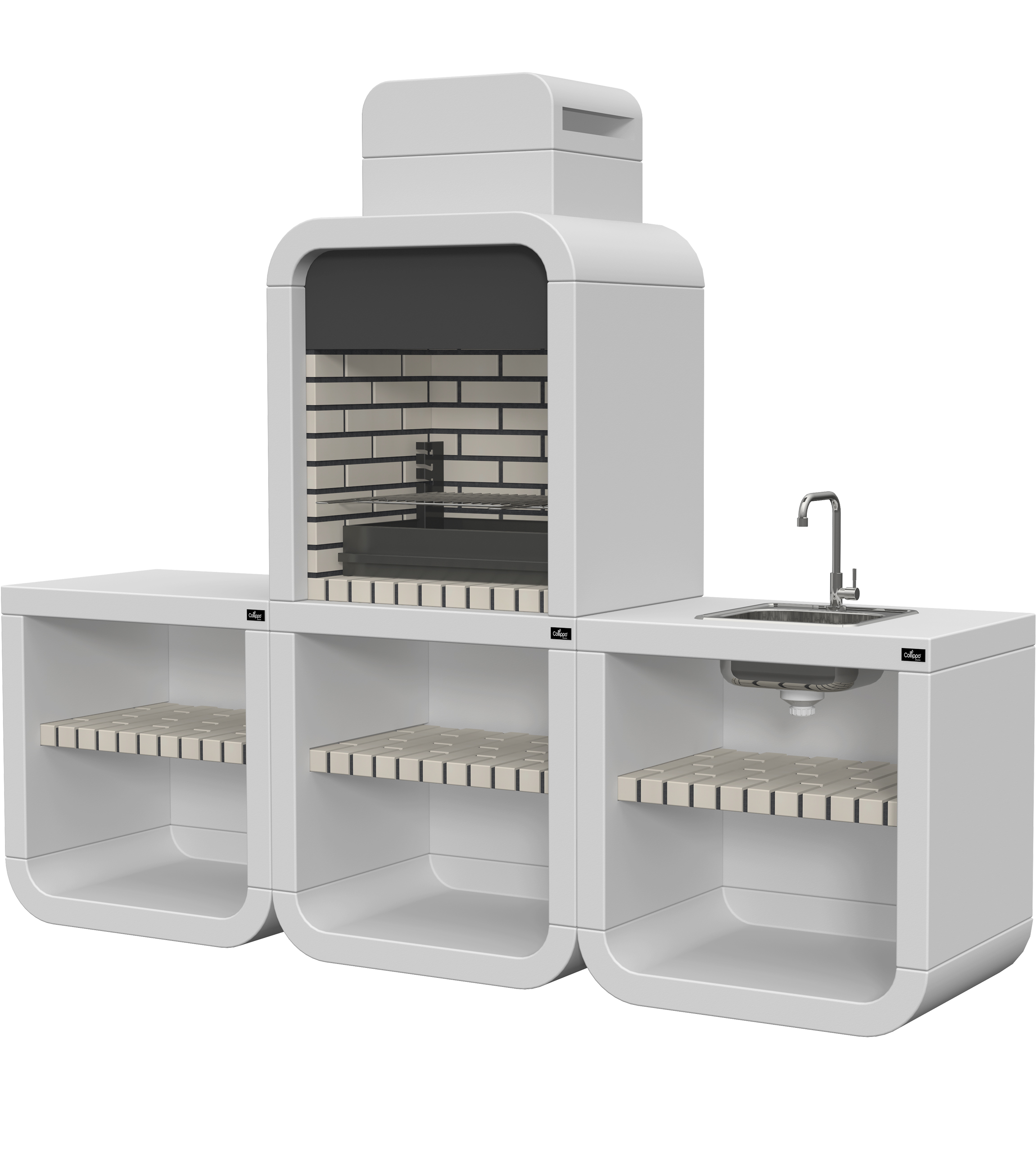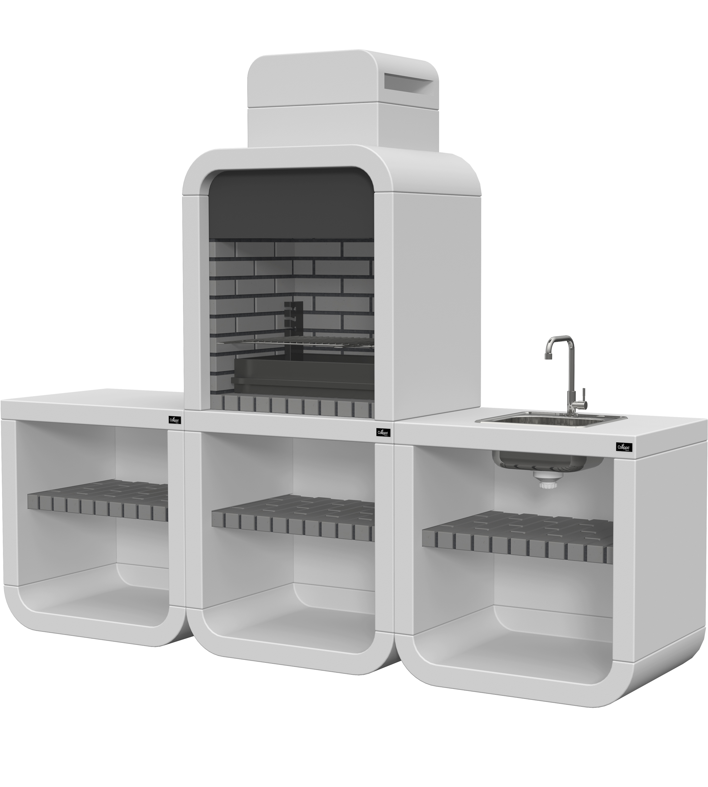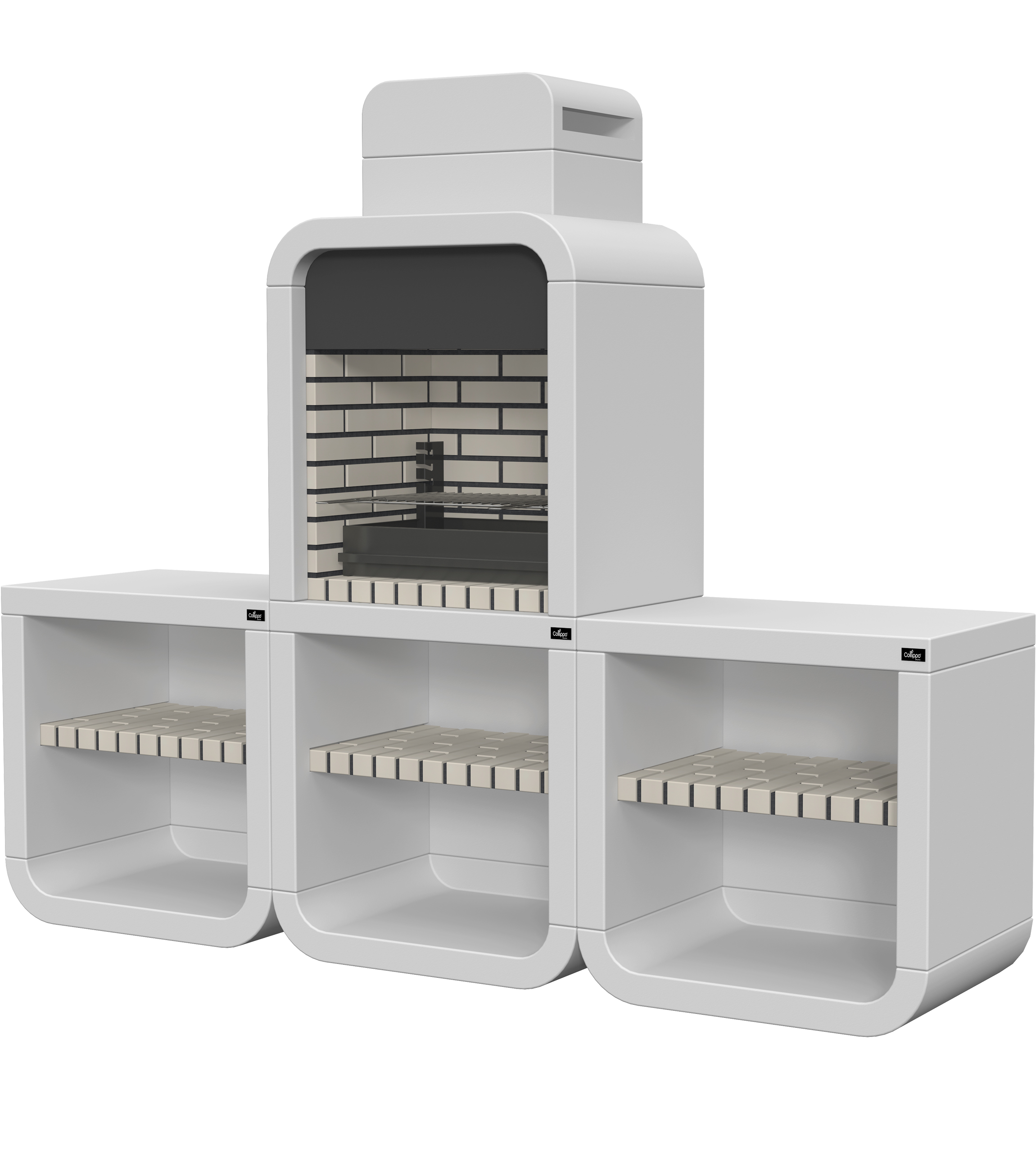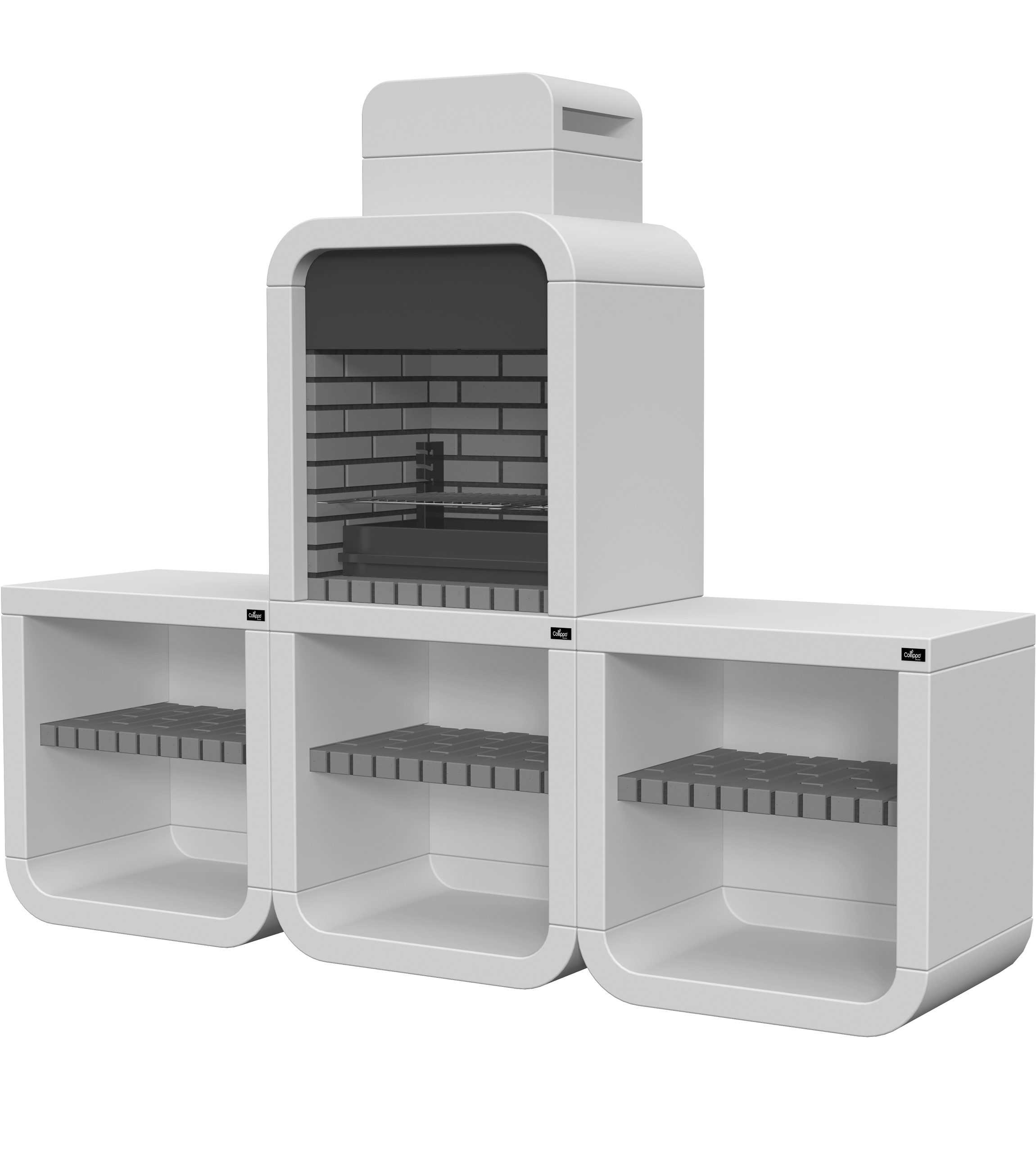 Micro betão liso branco; peça frontal com pintura preta; zona de fogo em tijolo e cimento refractário.