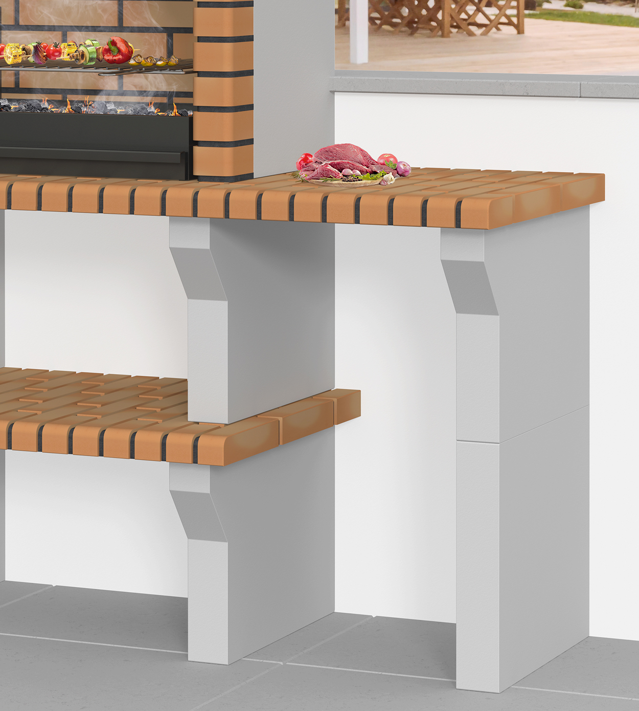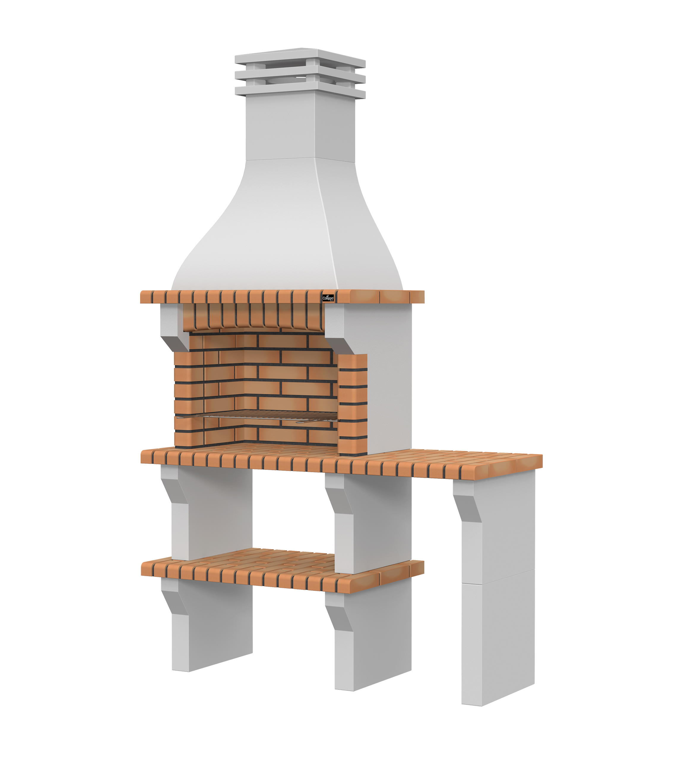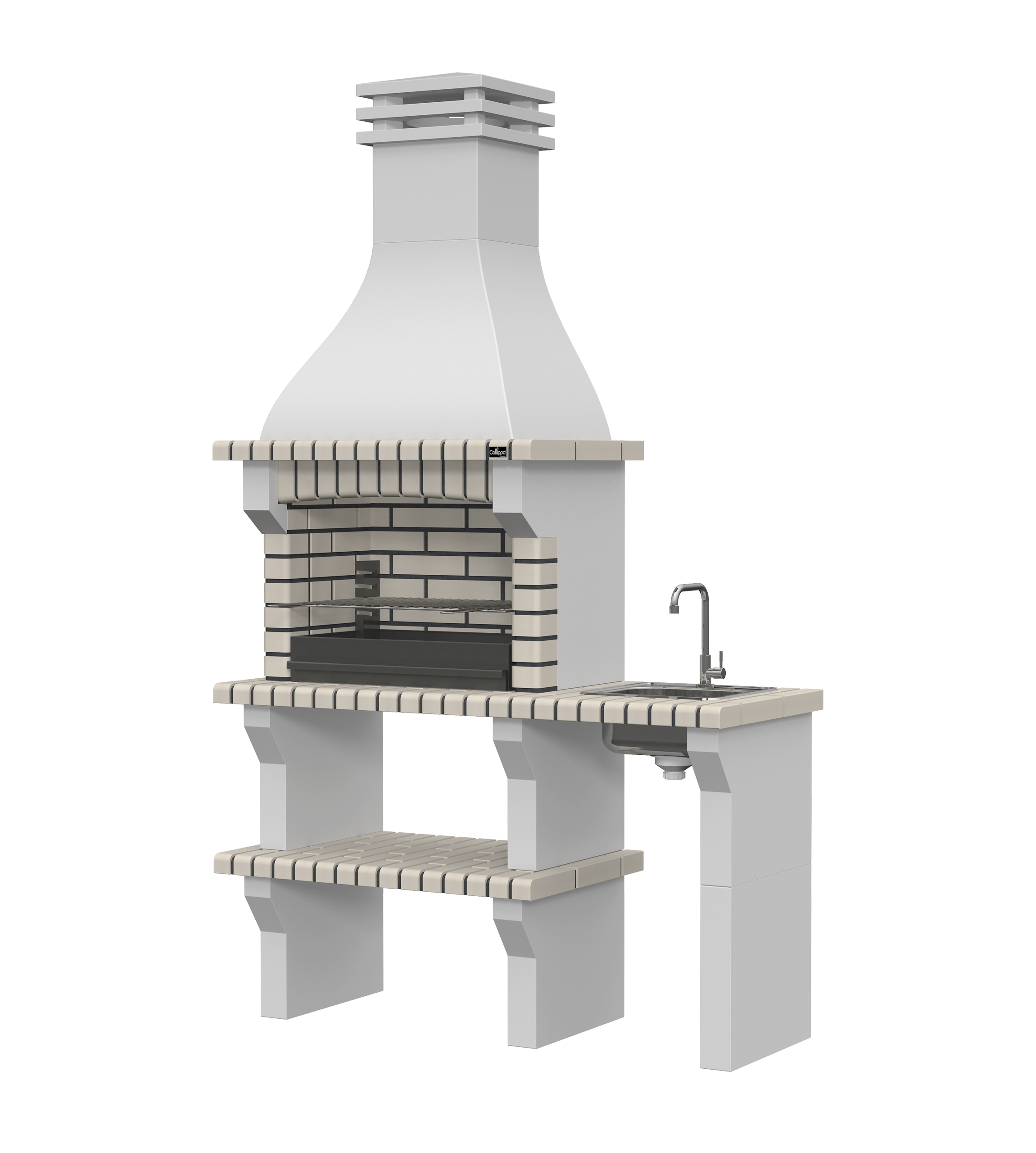 Peças em micro betão cinzento liso e micro betão cinzento texturado; zona de fogo em tijolo e cimento refractário