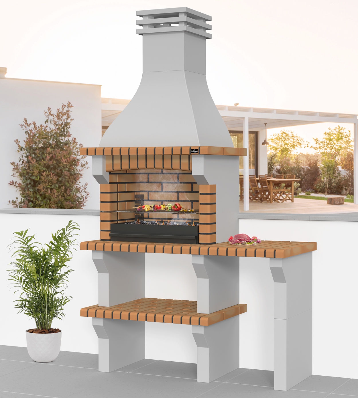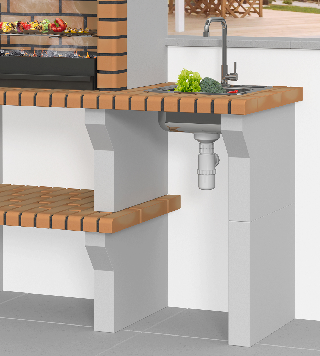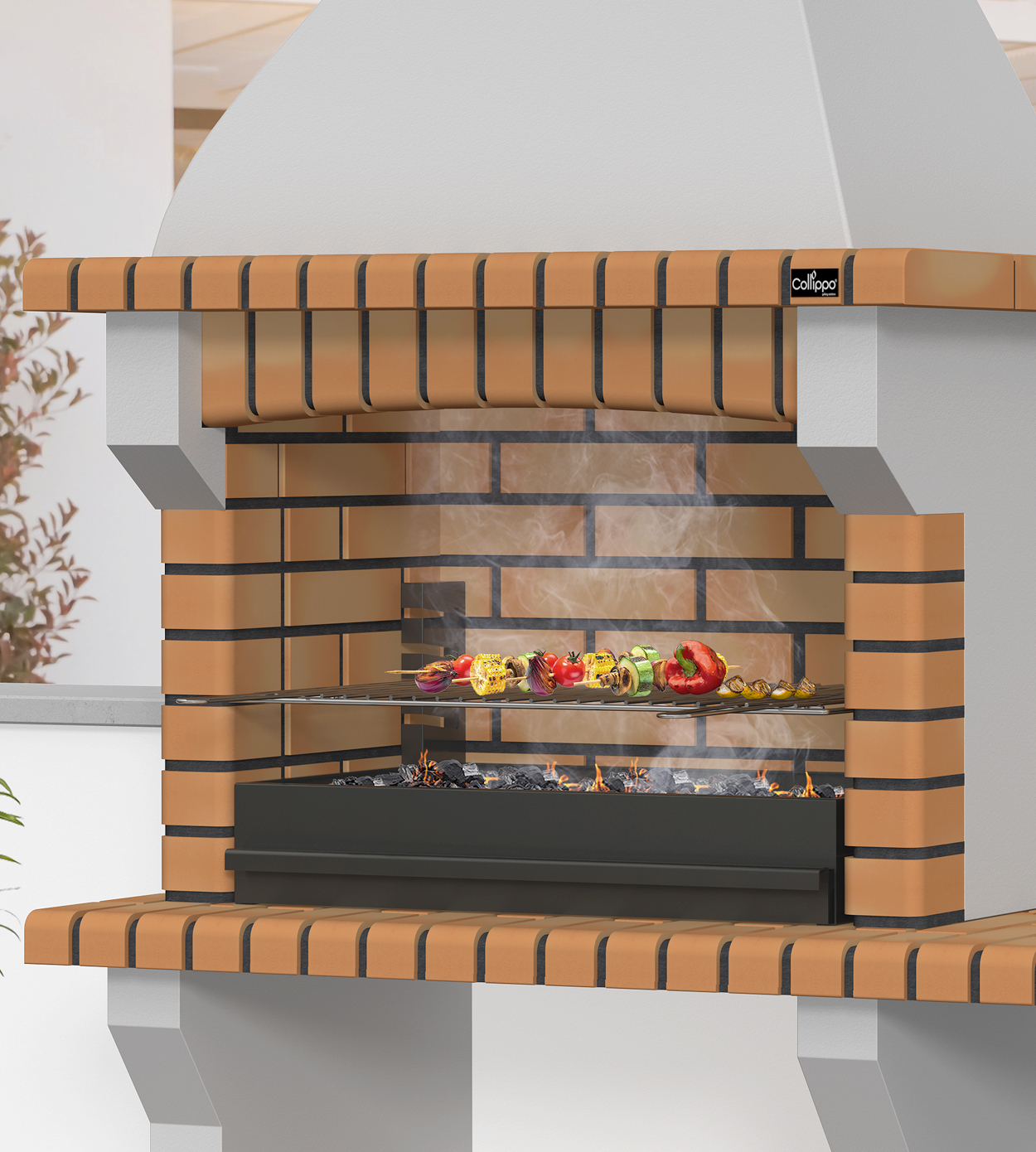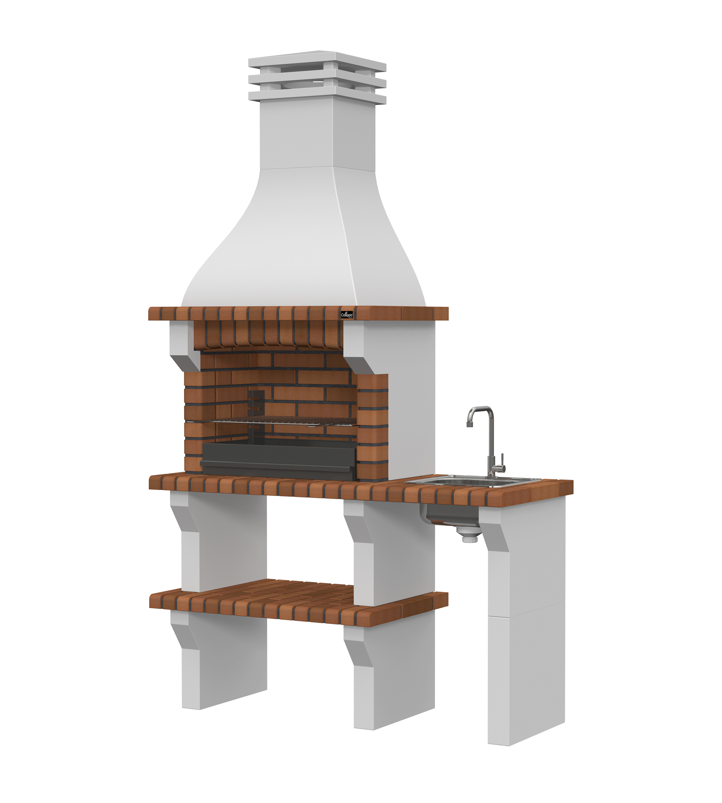 Peças em micro betão cinzento liso e micro betão cinzento texturado; zona de fogo em tijolo e cimento refractário