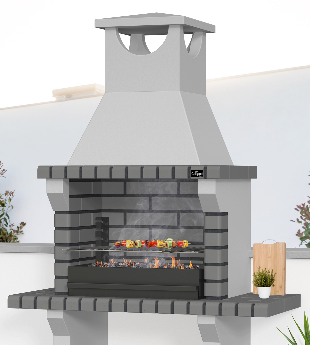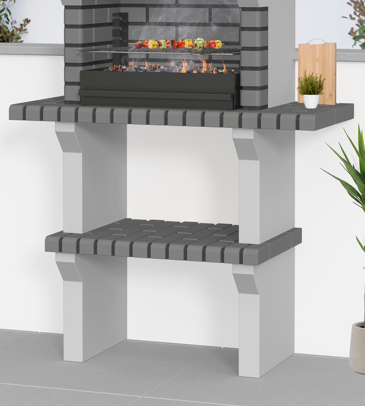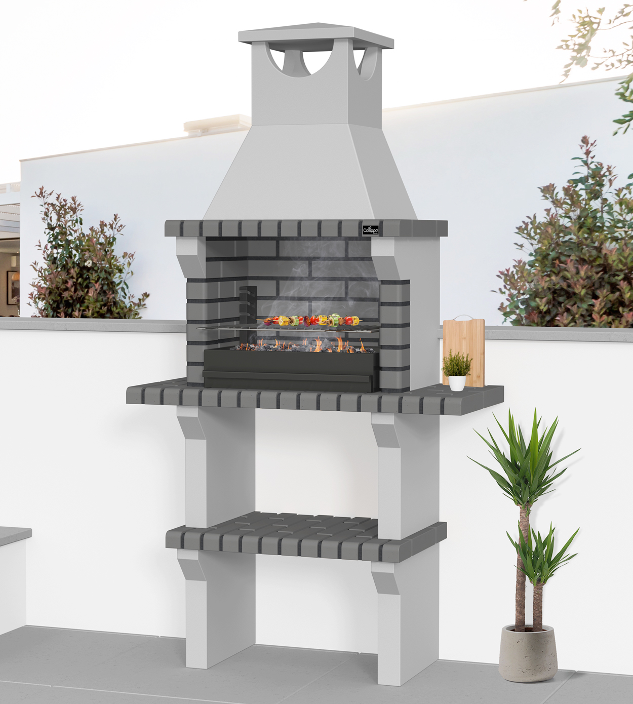 Peças em micro betão cinzento liso e micro betão cinzento texturado; zona de fogo em tijolo e cimento refractário
