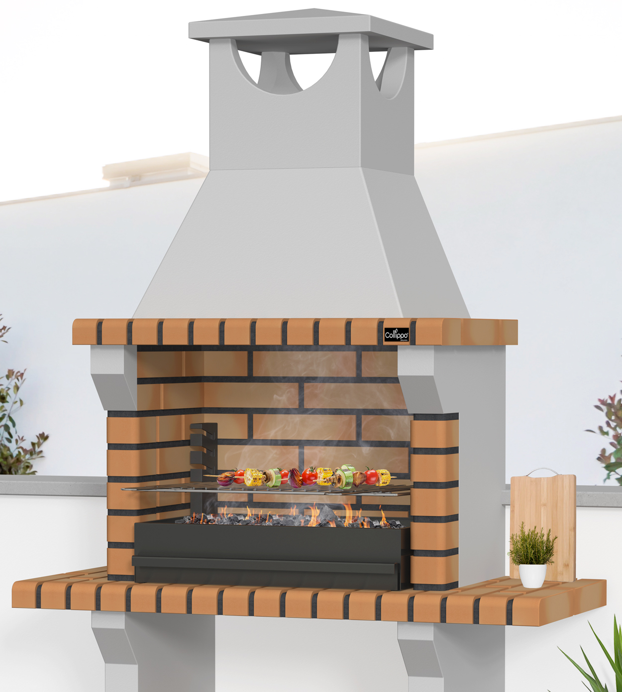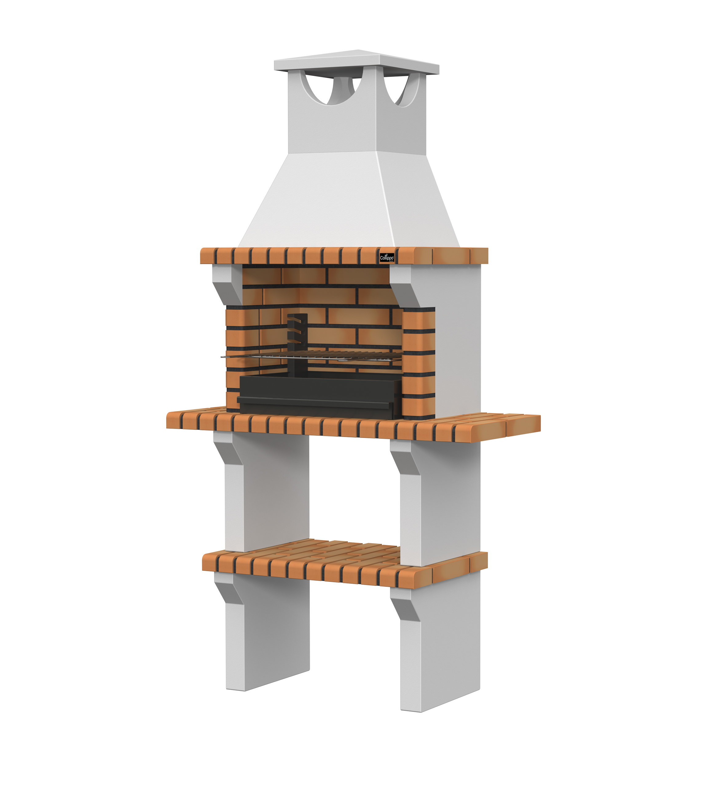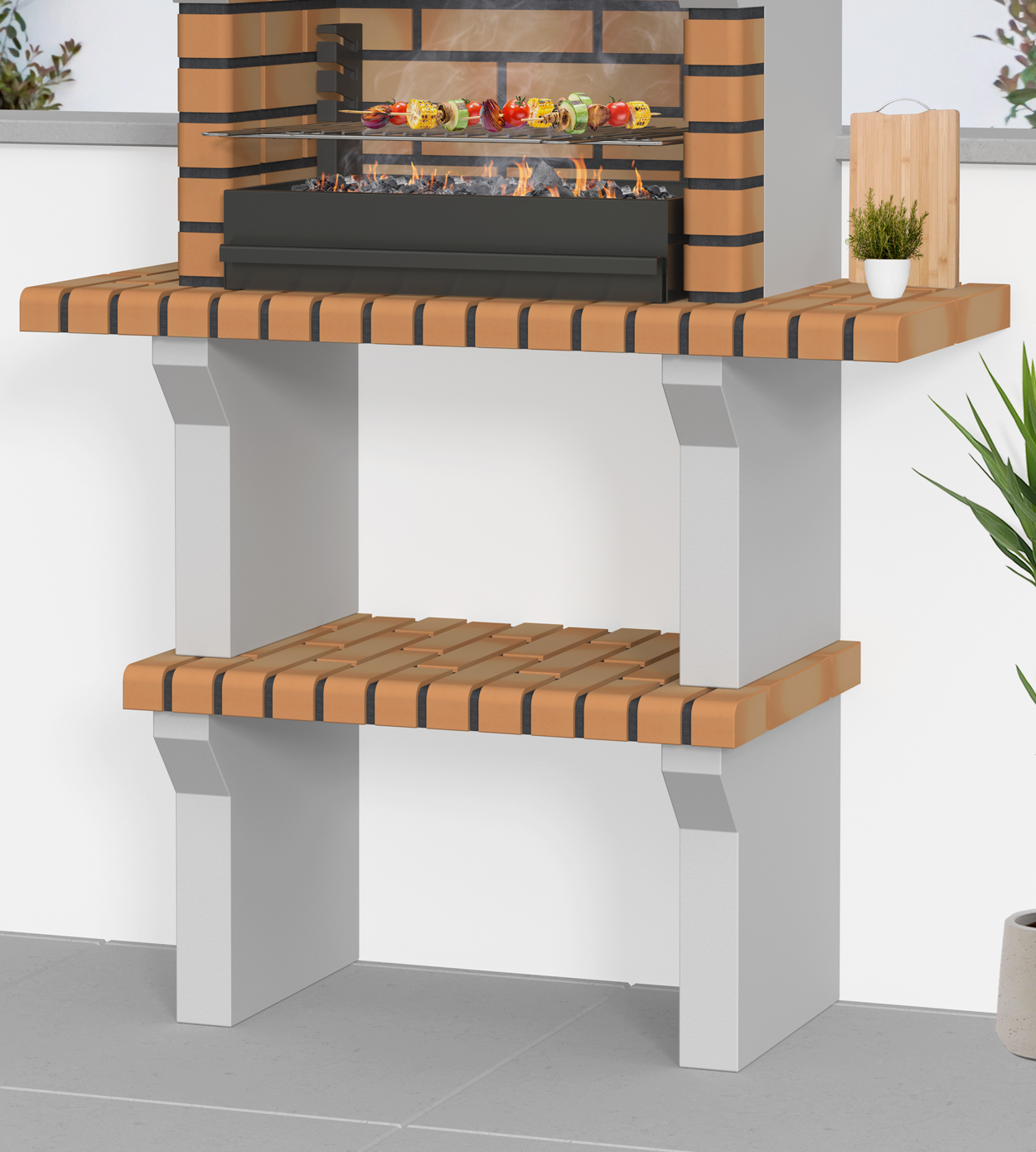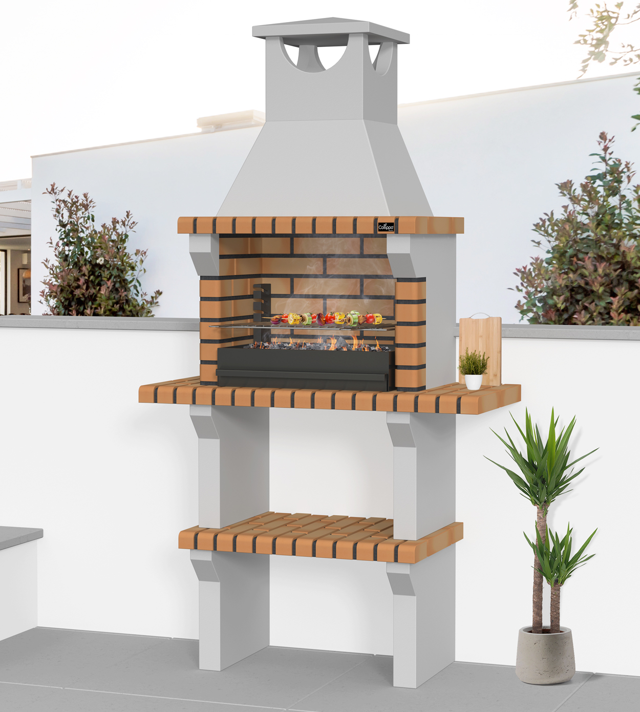 Peças em micro betão cinzento liso e micro betão cinzento texturado; zona de fogo em tijolo e cimento refractário