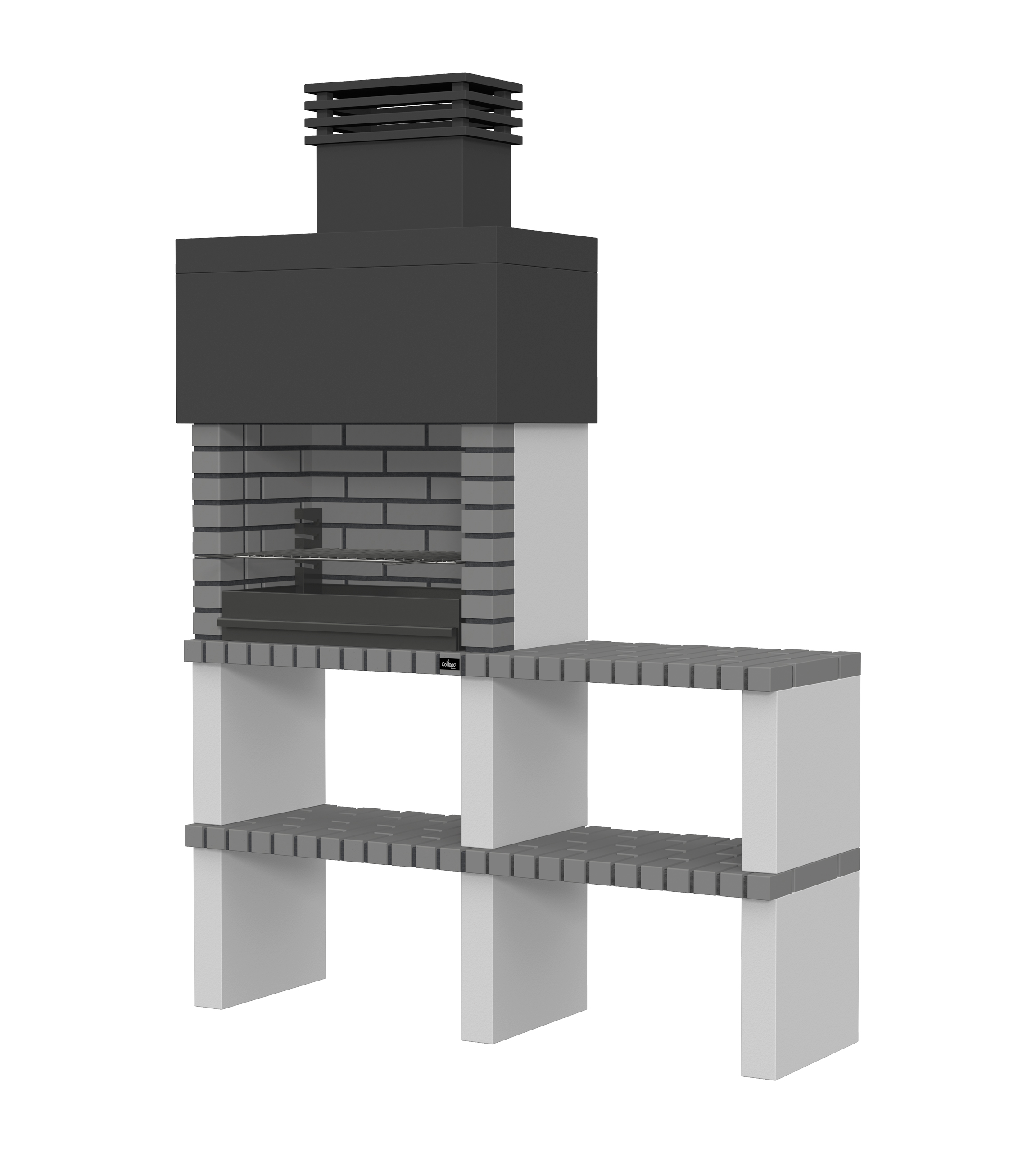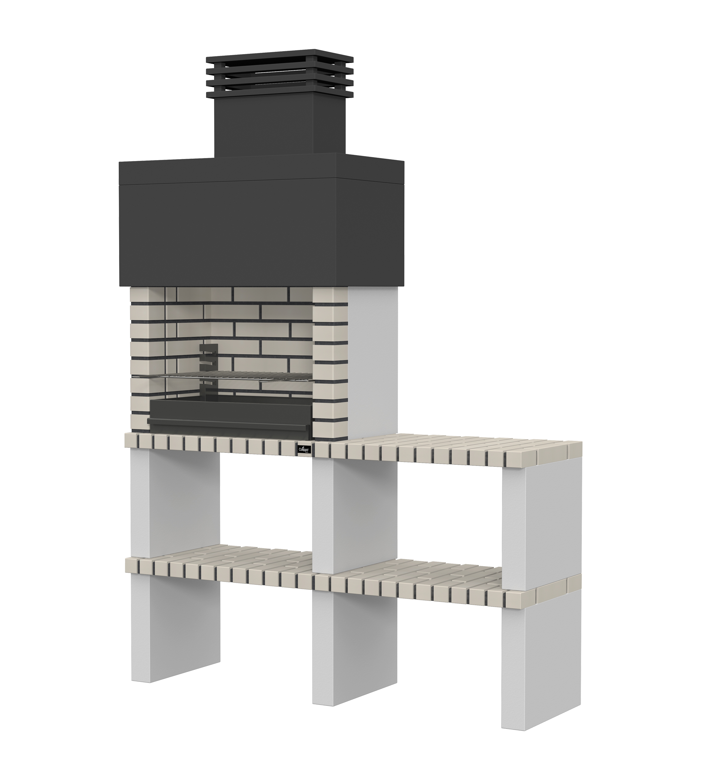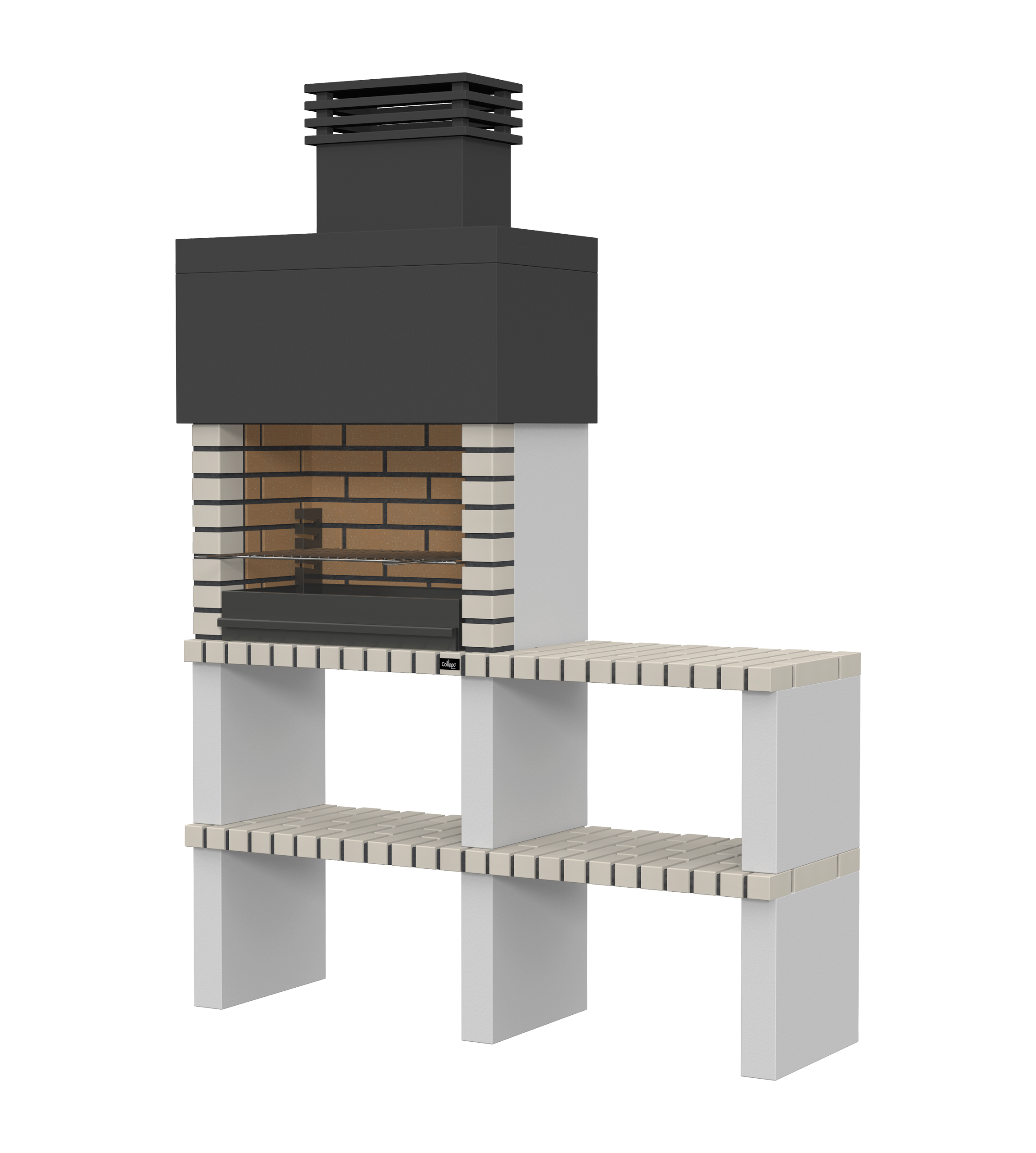Micro betão liso com pintura preta; laterais e pés em micro betão texturado; zona de fogo em tijolo e cimento refractário