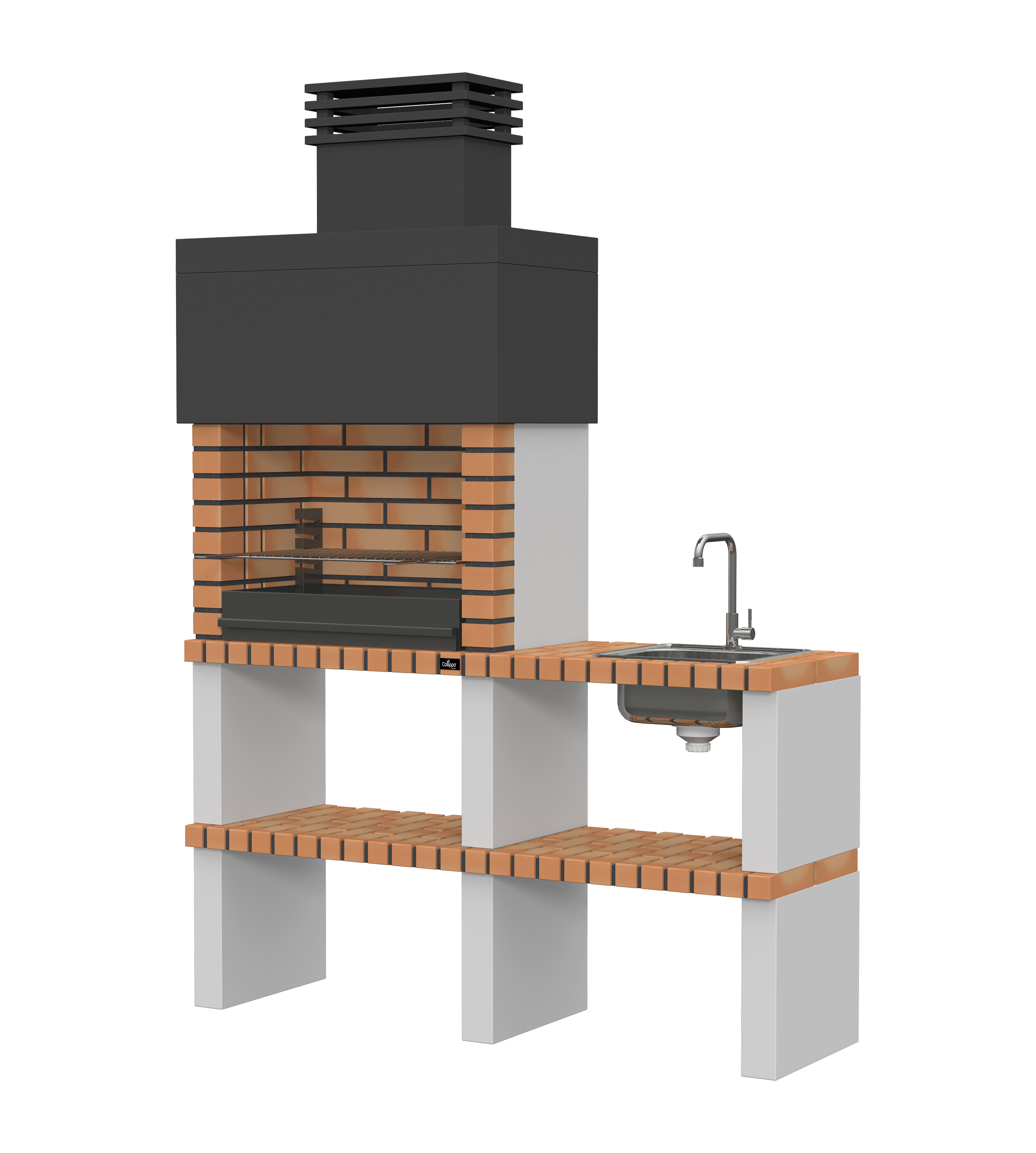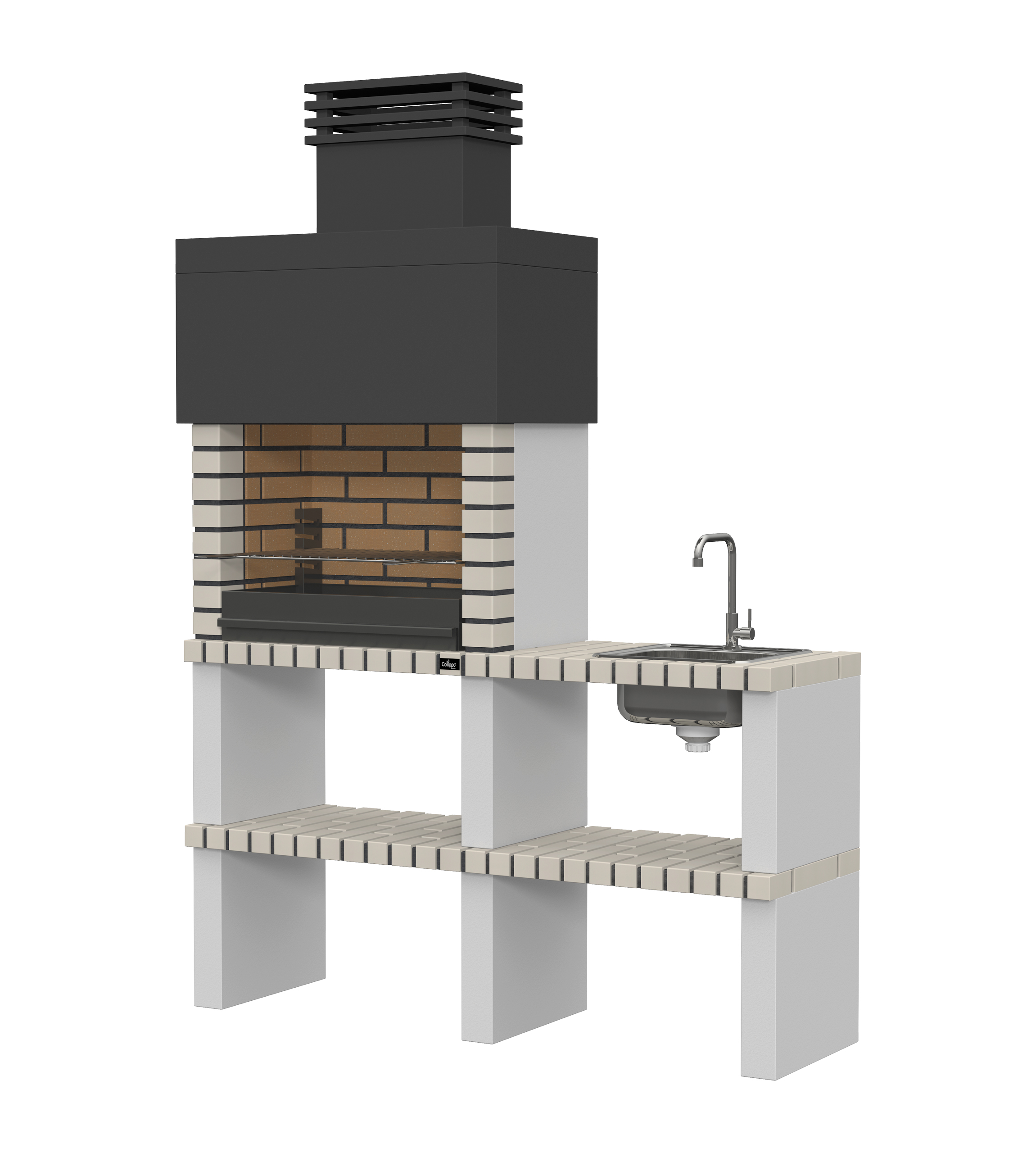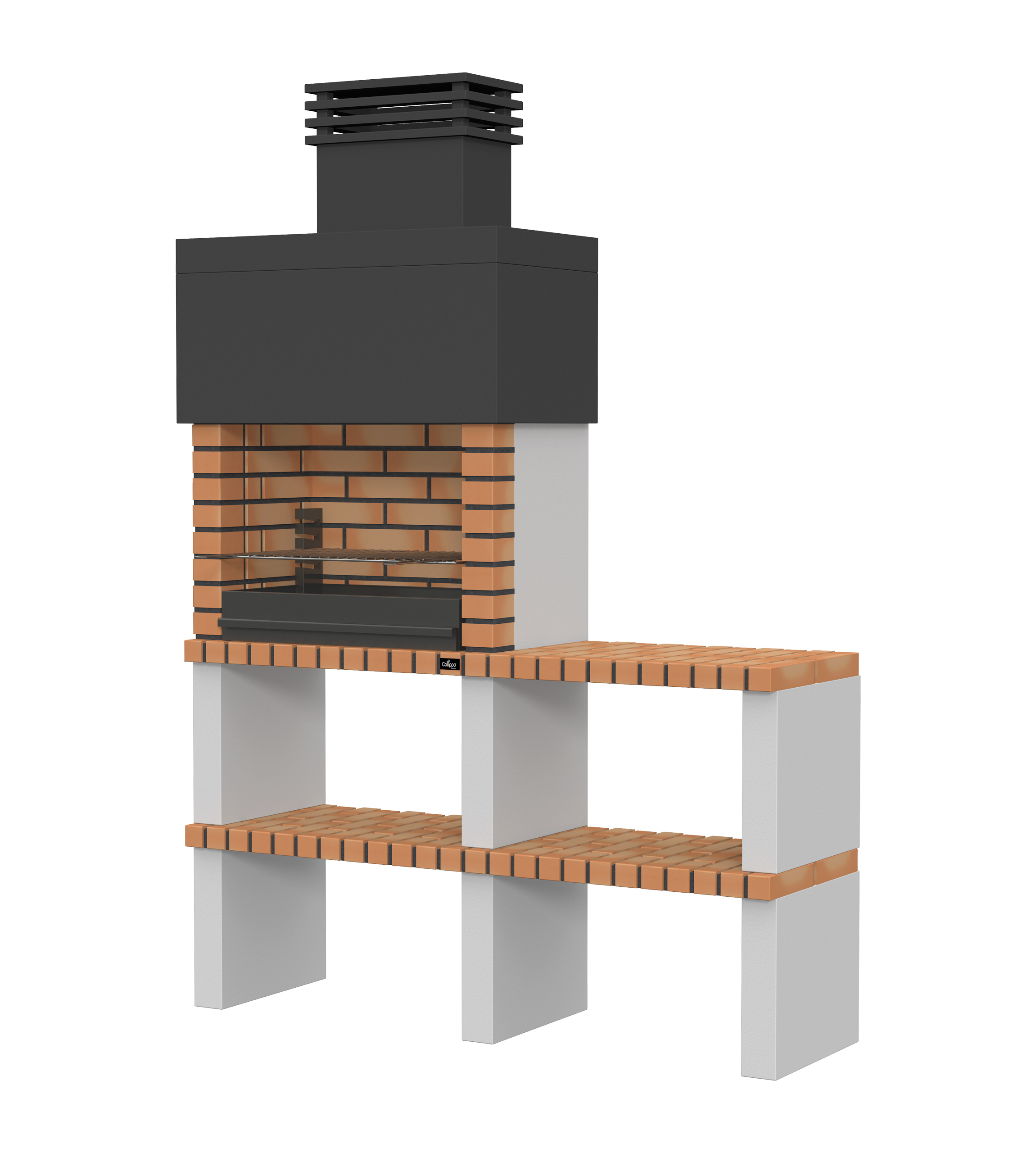 Micro betão liso com pintura preta; laterais e pés em micro betão texturado; zona de fogo em tijolo e cimento refractário