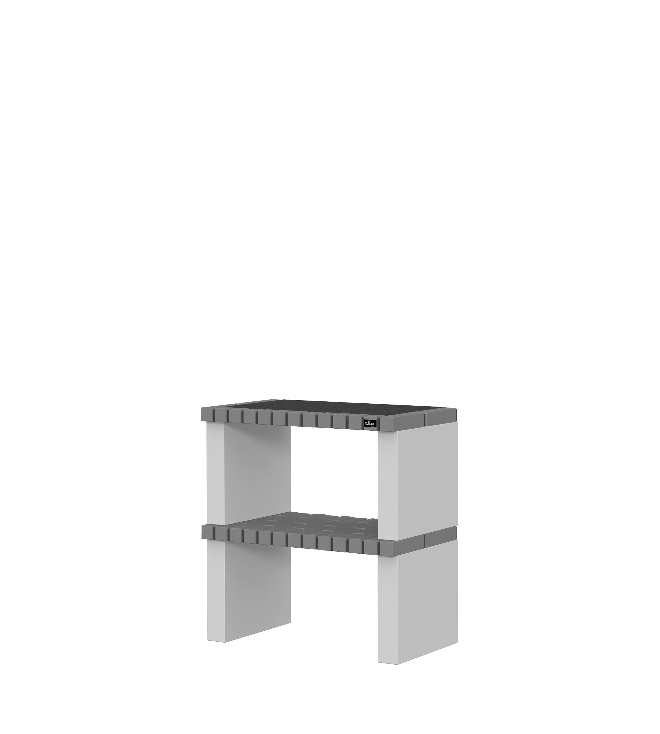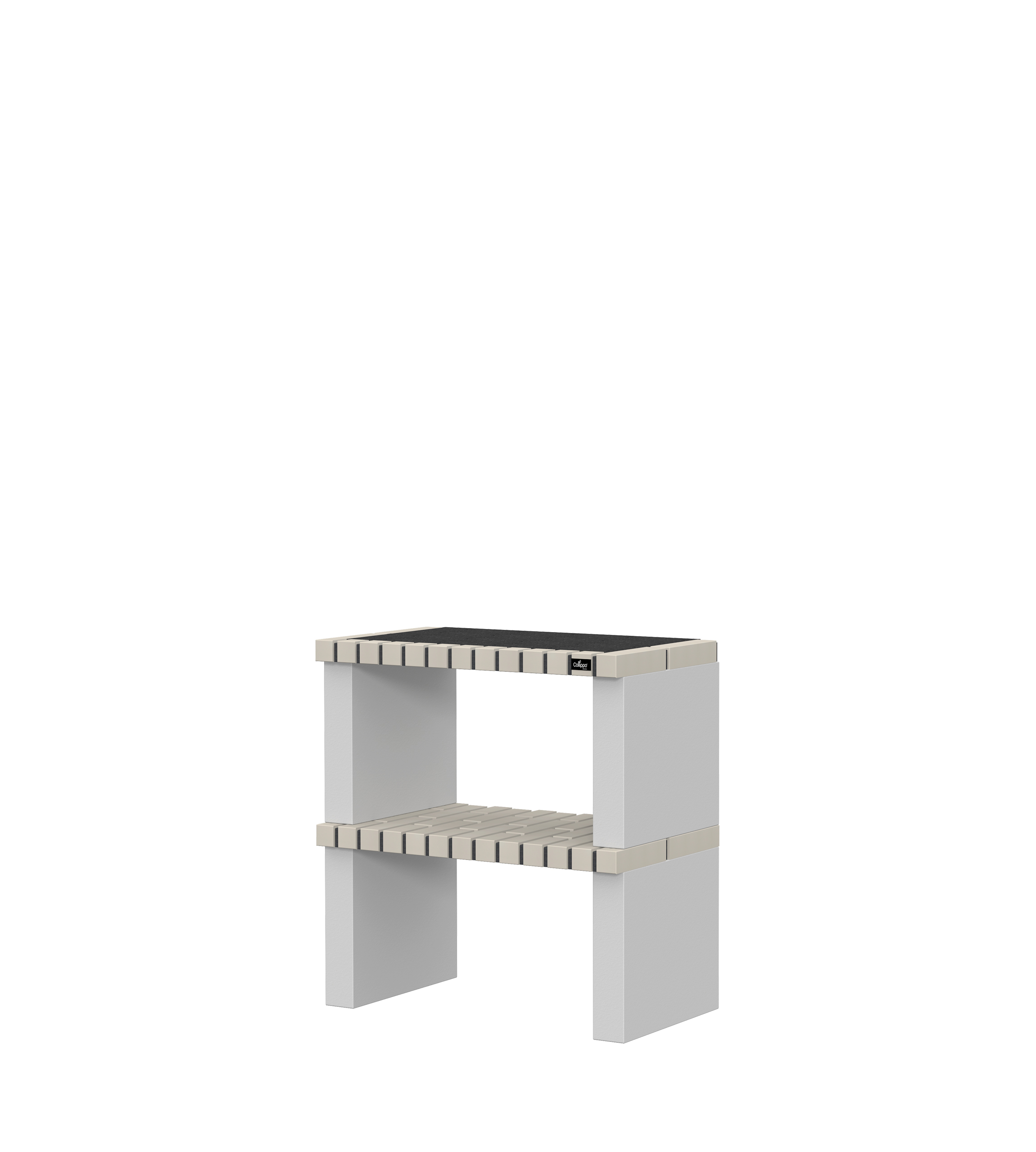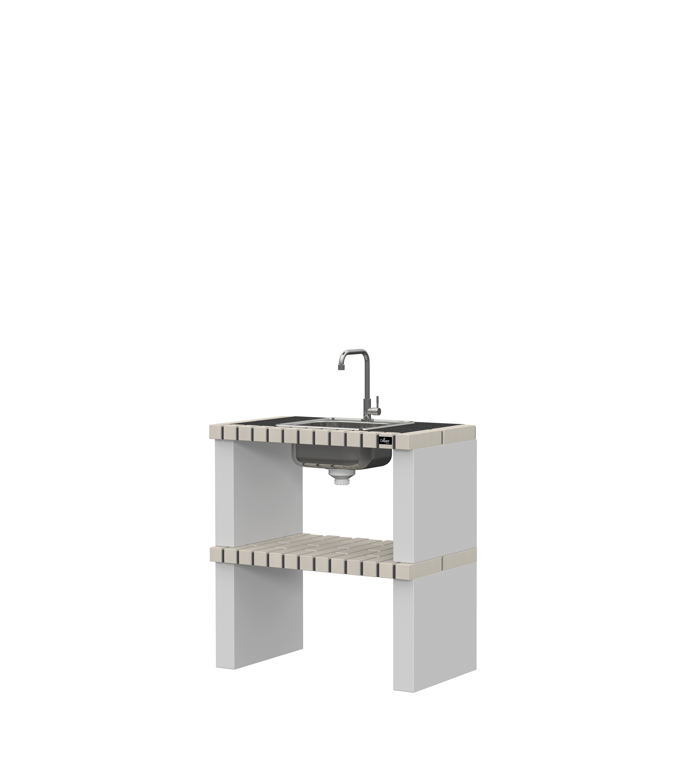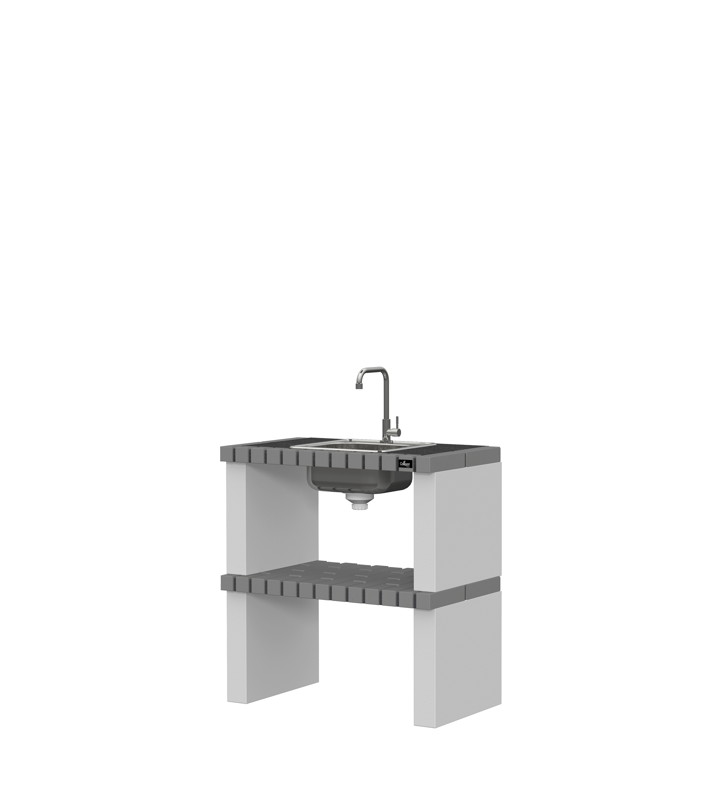 Micro betão texturado cinzento; bancada em granito e tijolo