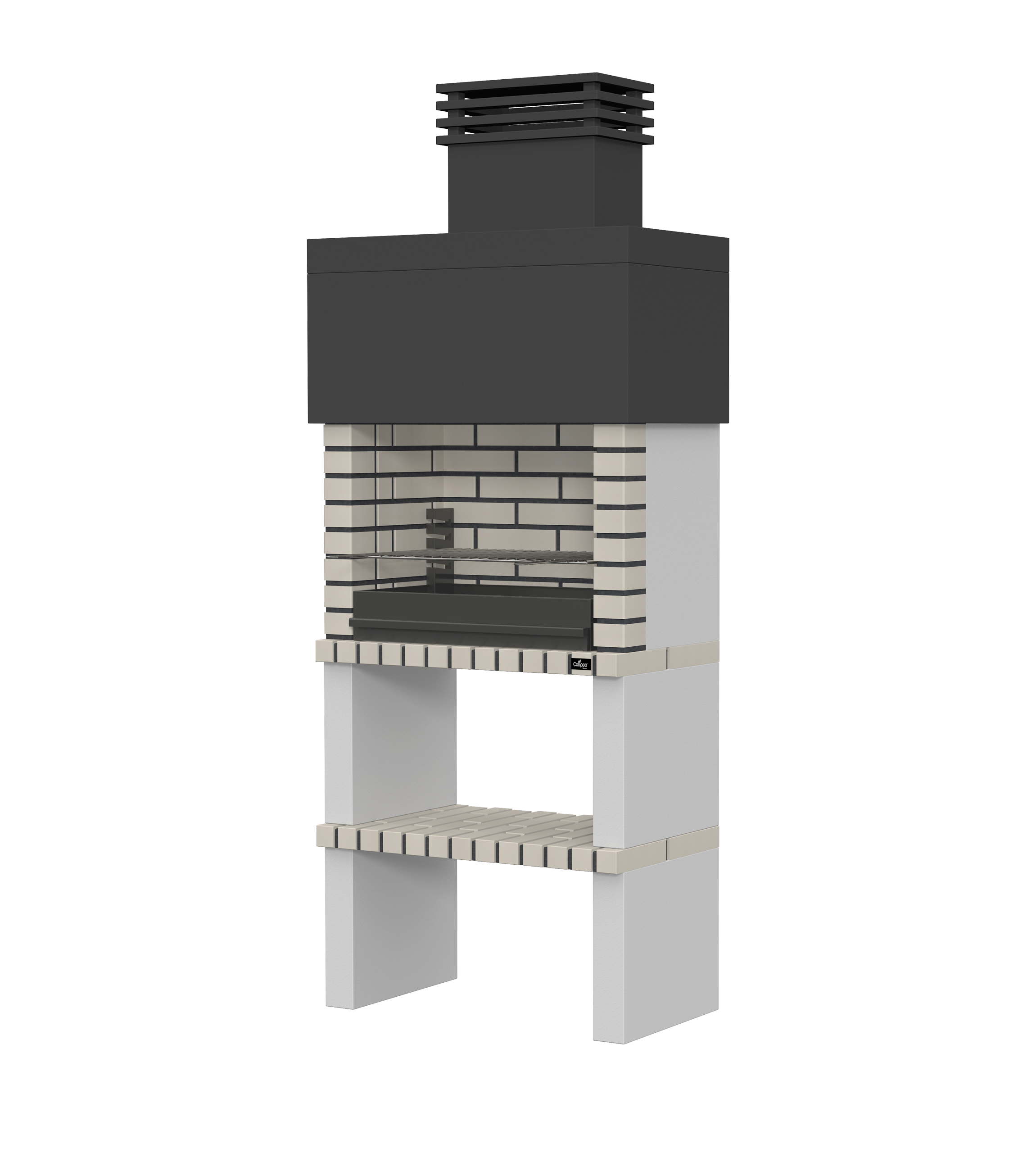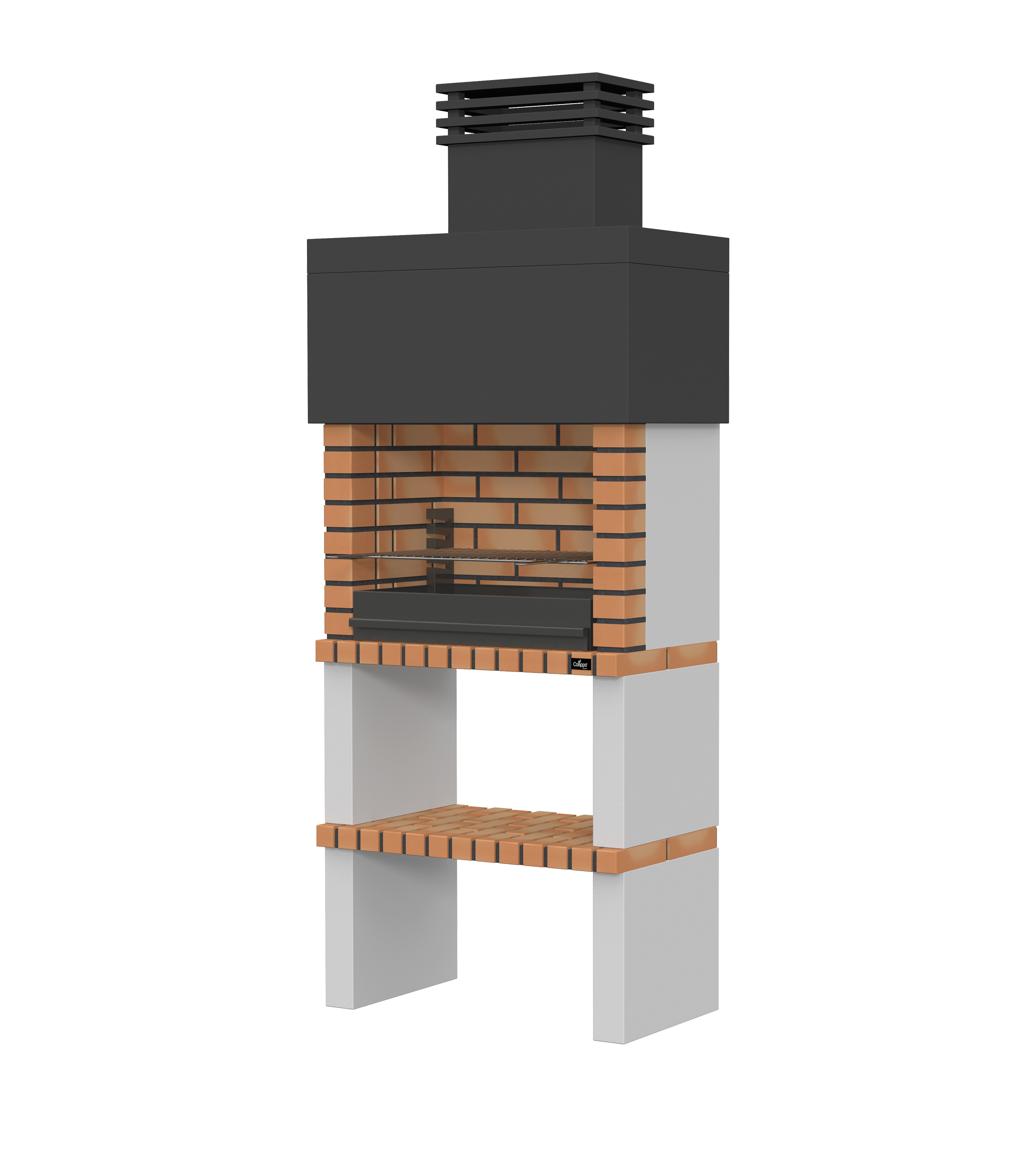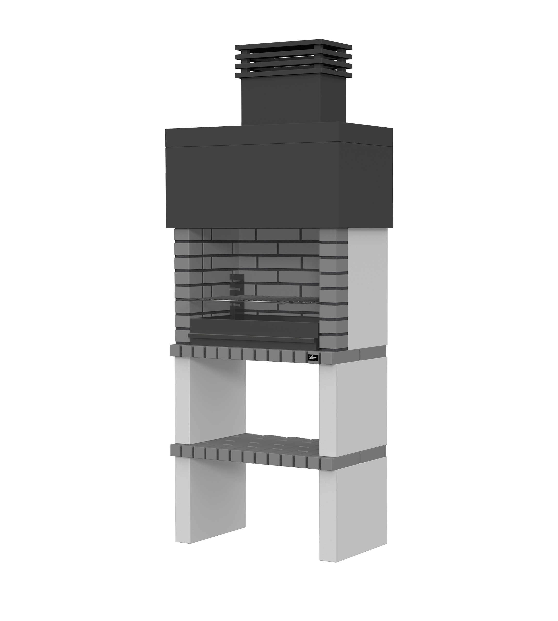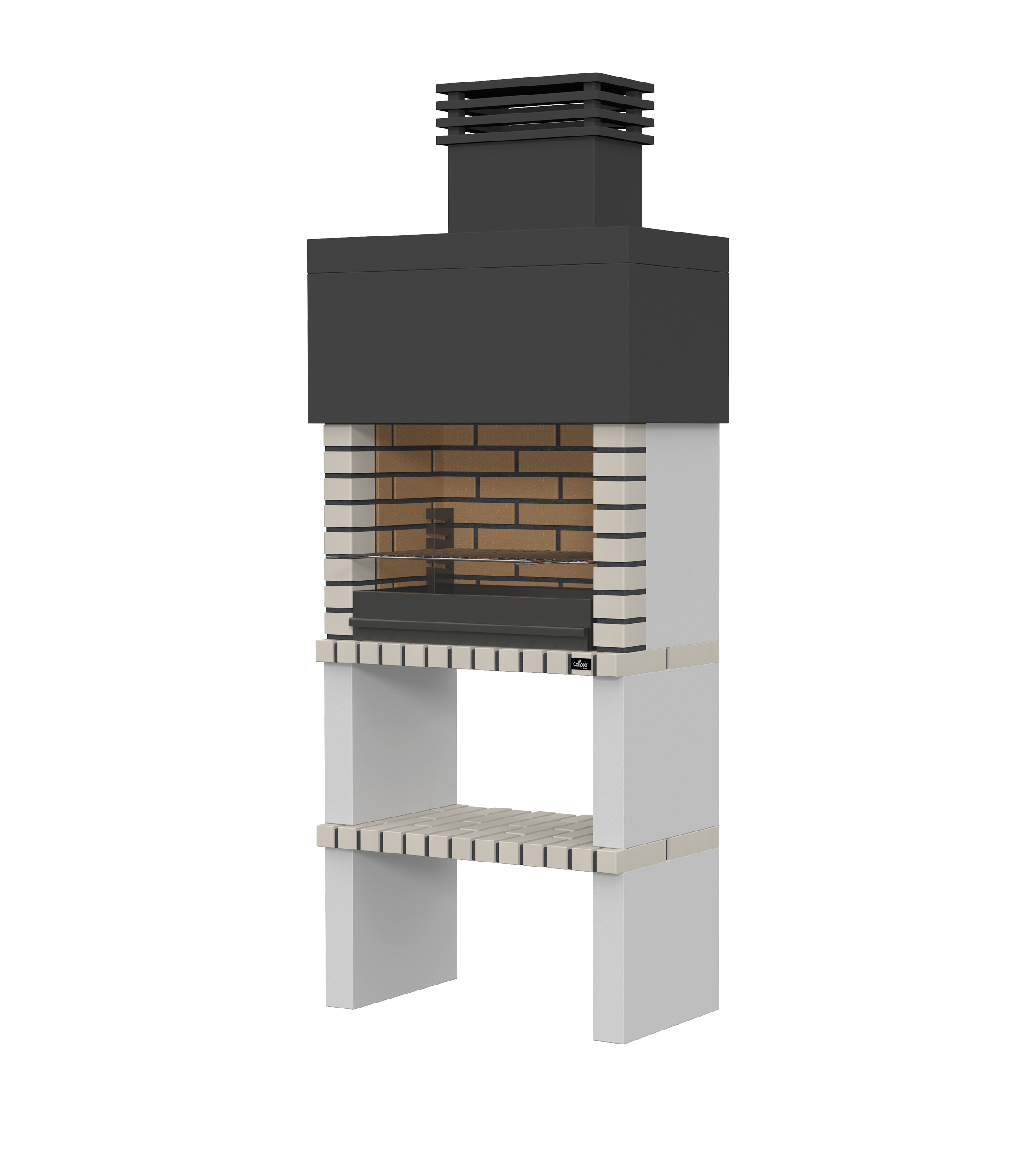 Micro betão liso com pintura preta; laterais e pés em micro betão texturado; zona de fogo em tijolo e cimento refractário