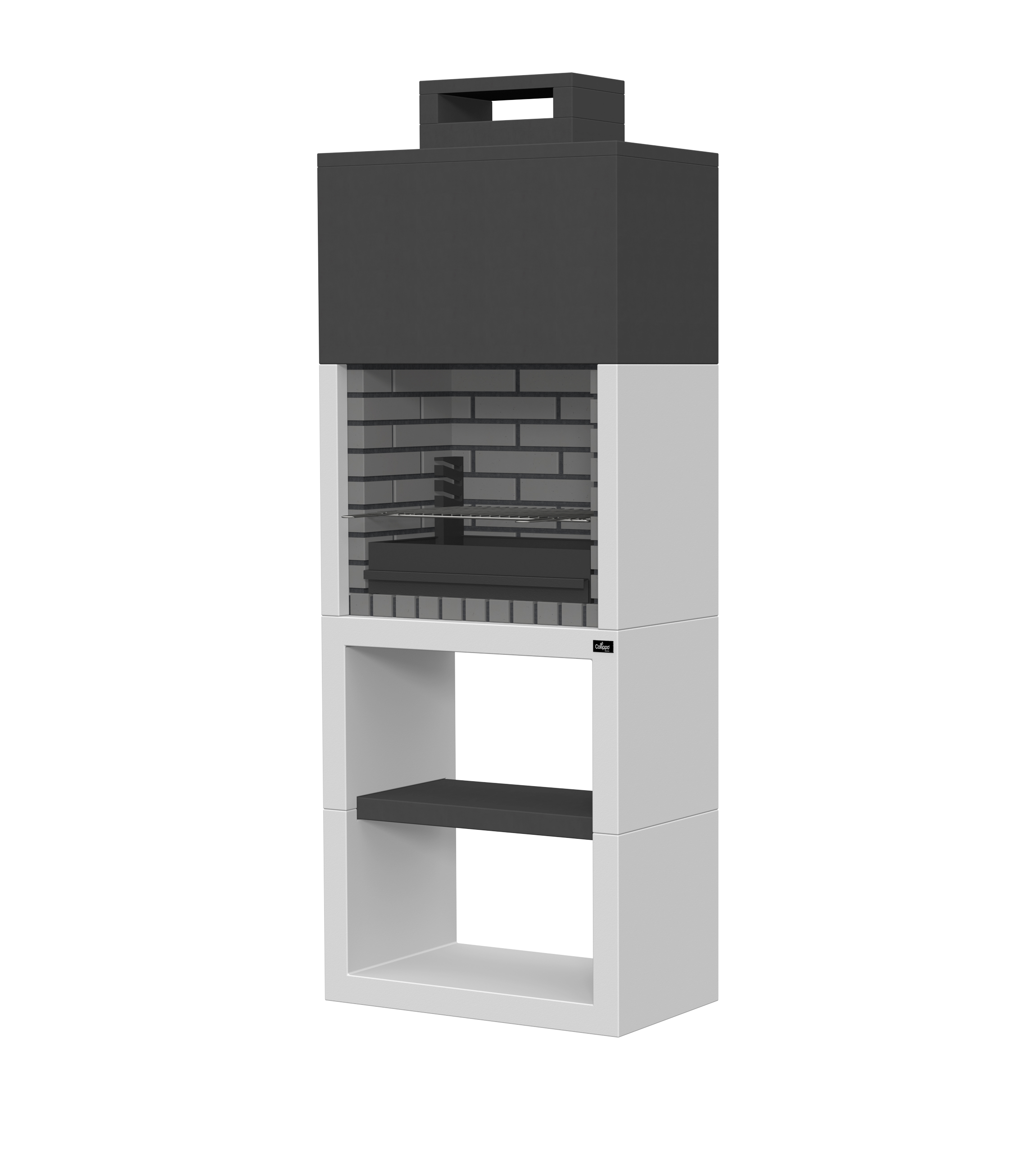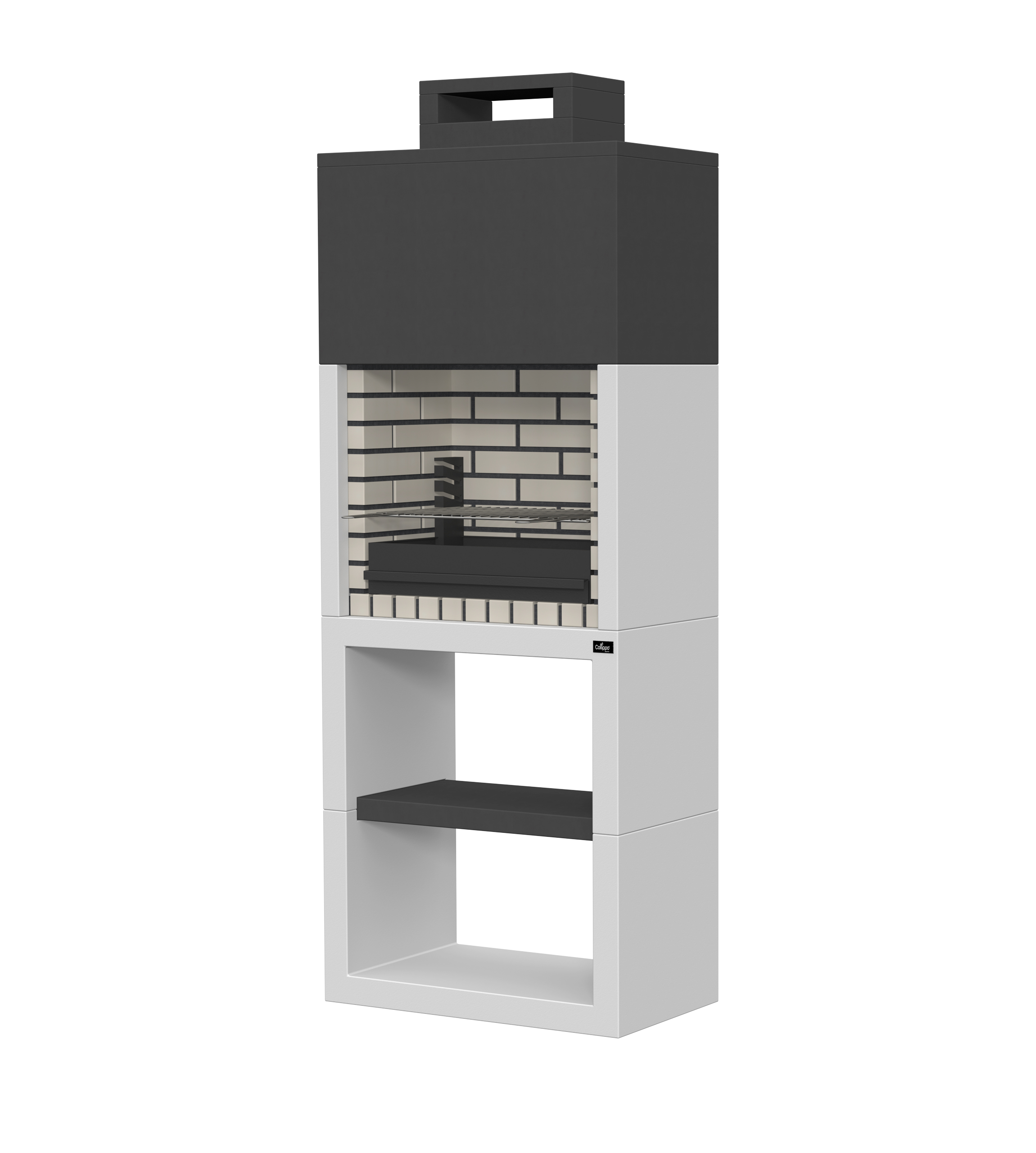 Micro betão liso branco; peças com pintura preta; zona de fogo em tijolo e cimento refractário.