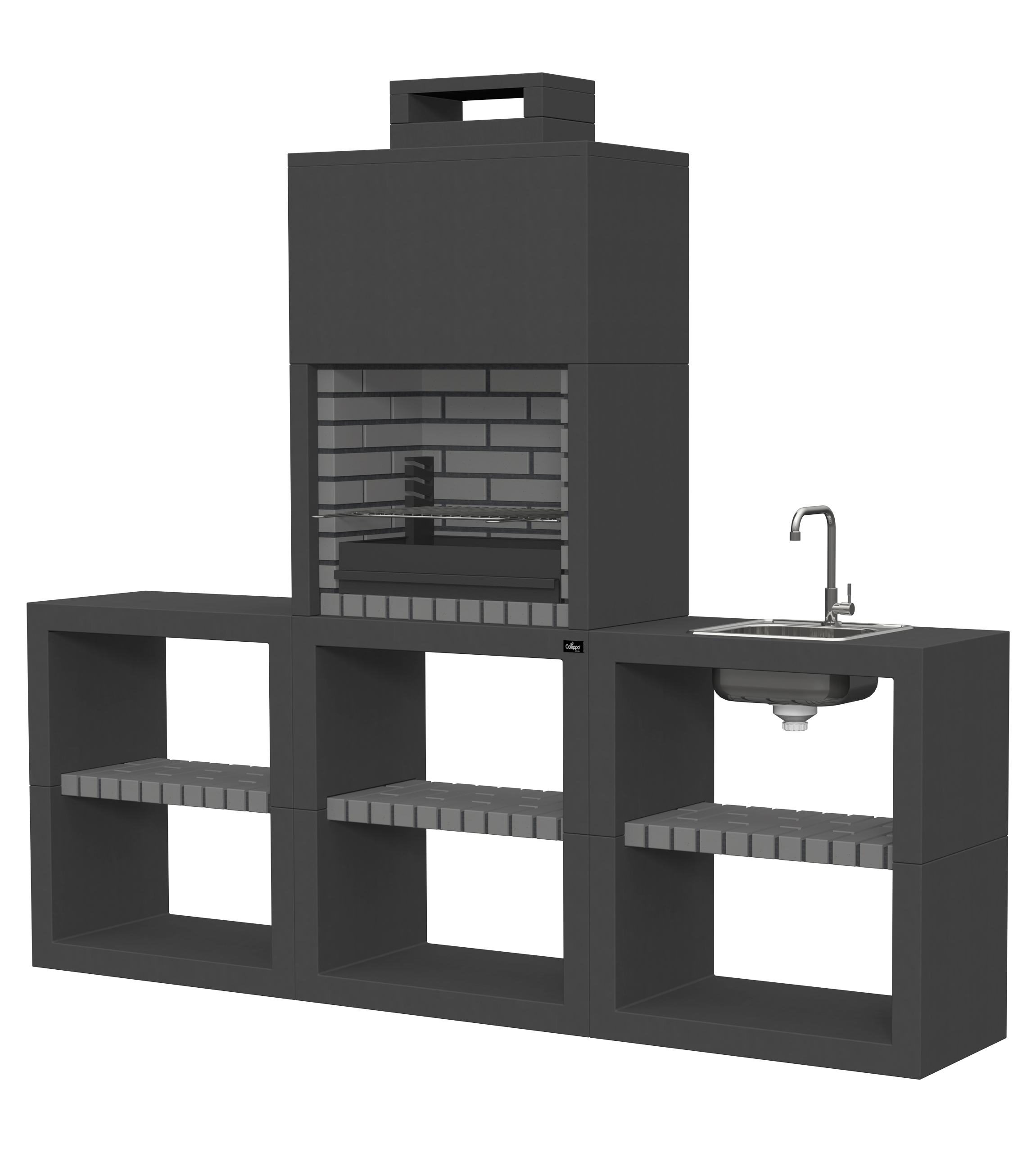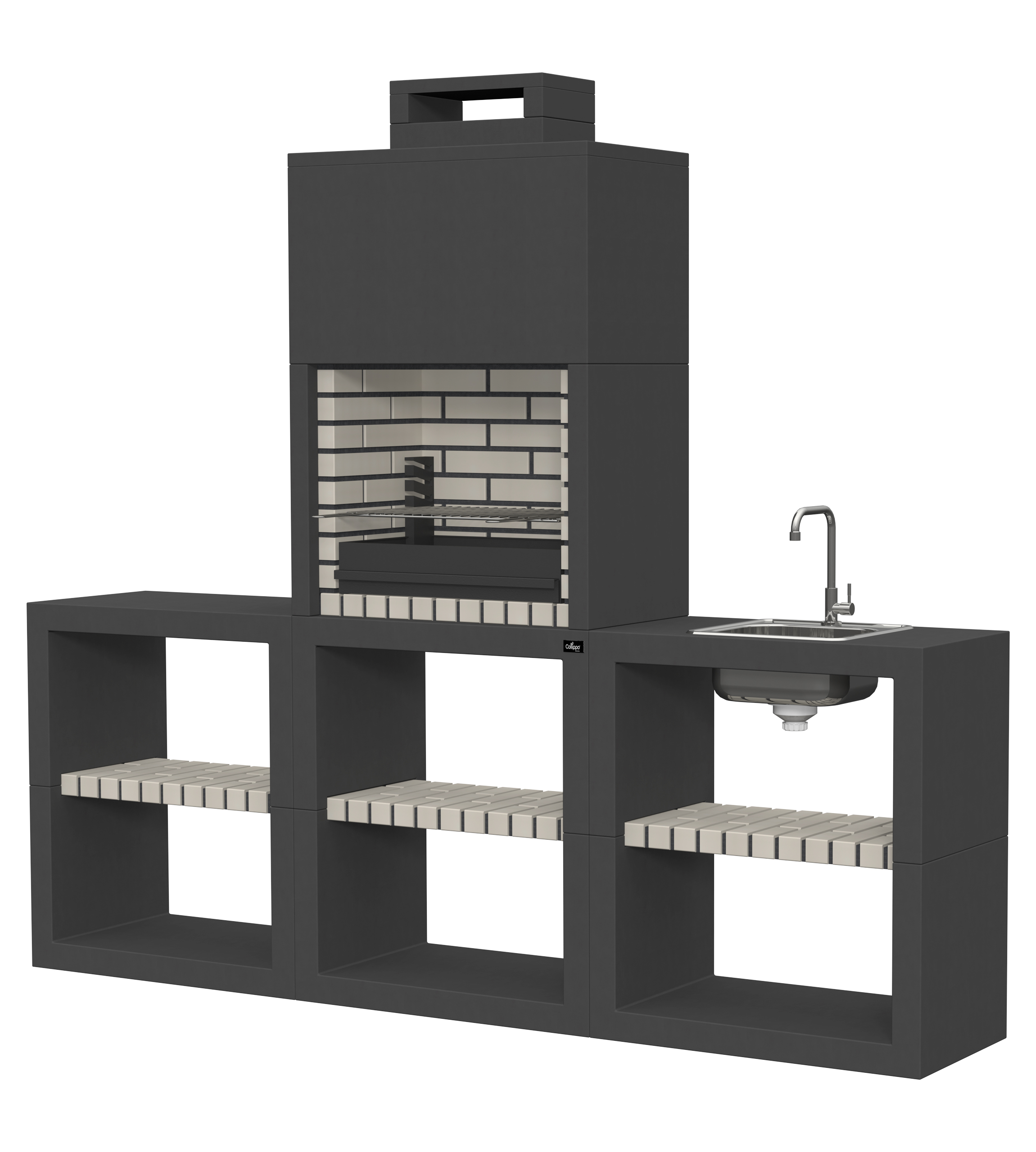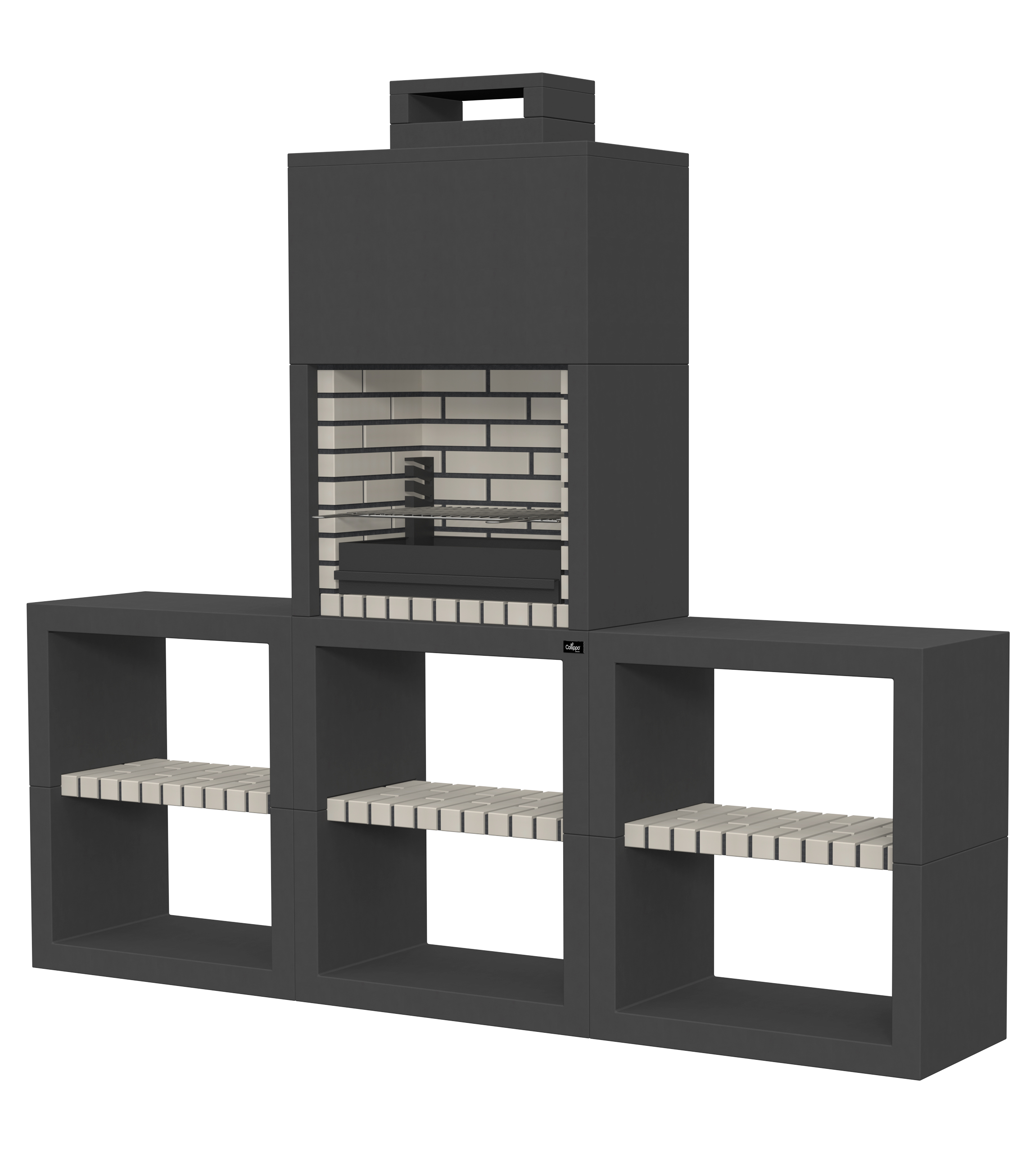 Micro betão liso branco; peças com pintura preta; zona de fogo em tijolo e cimento refractário.