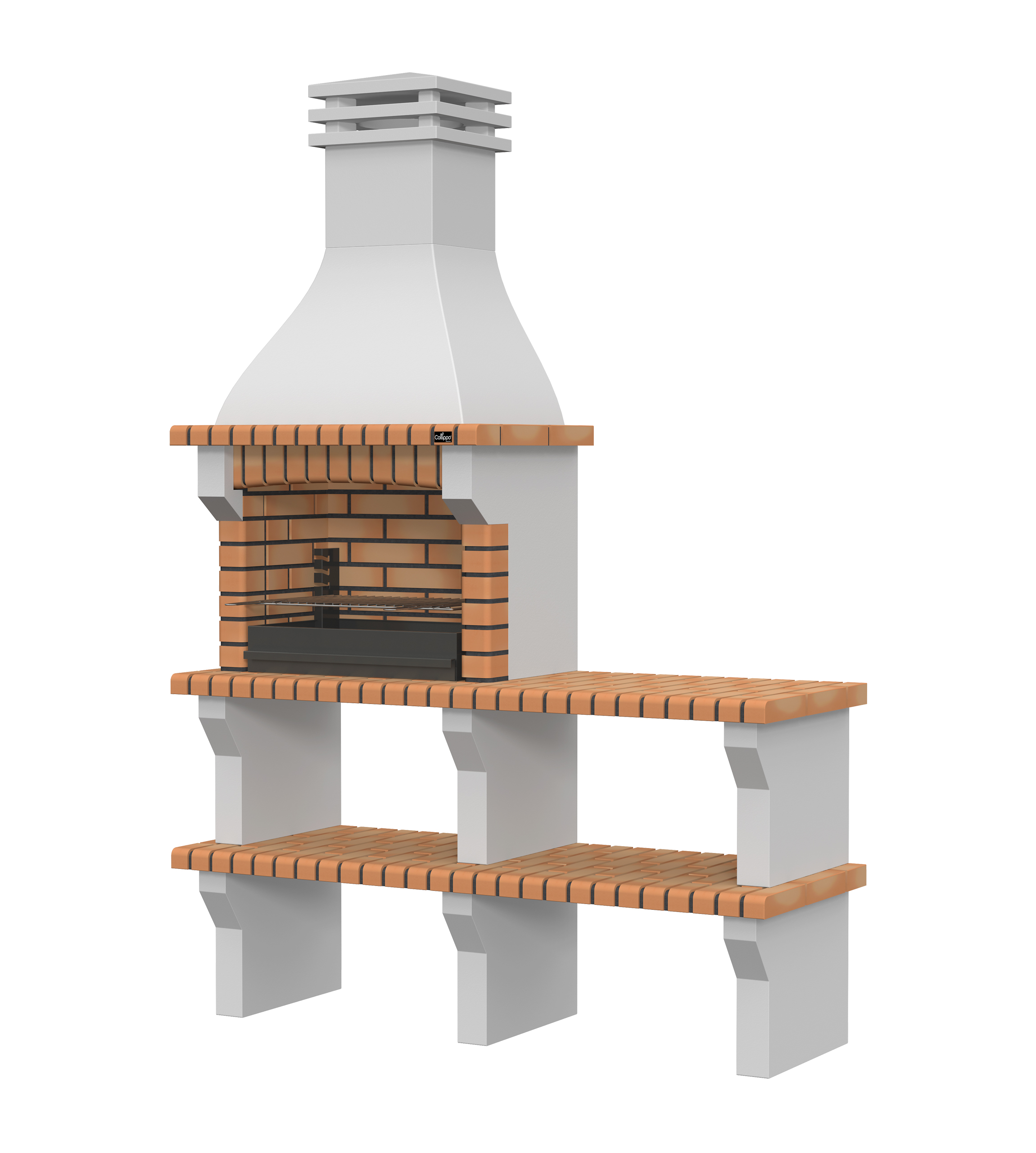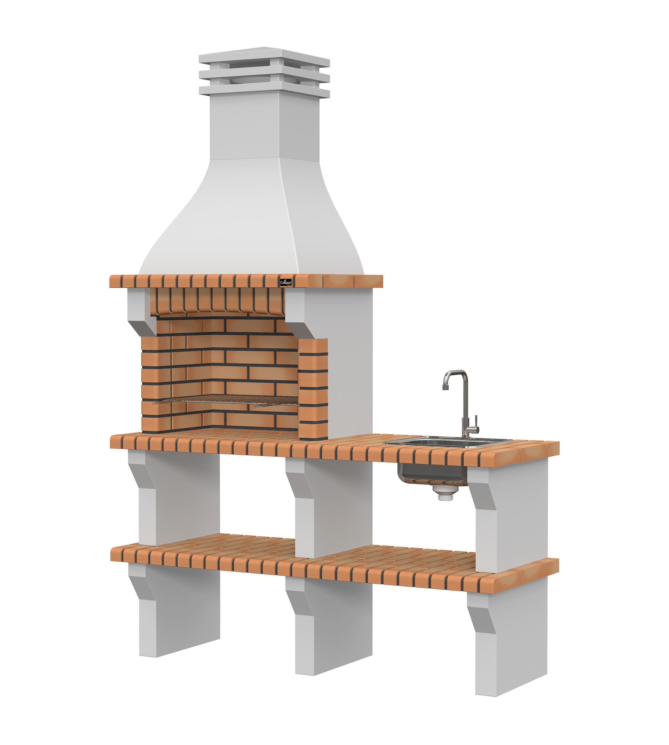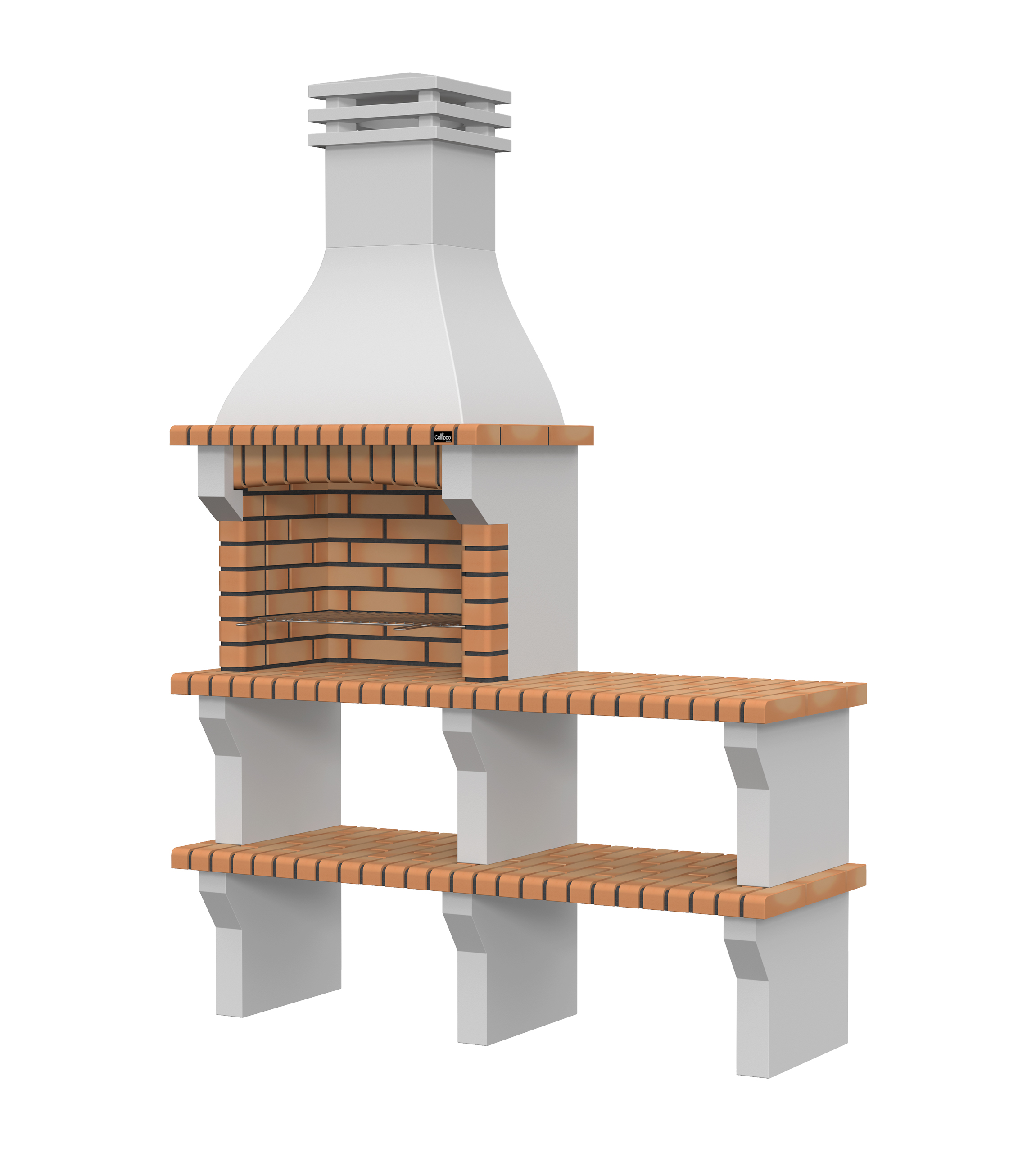 Peças em micro betão cinzento liso e micro betão cinzento texturado; zona de fogo em tijolo e cimento refractário