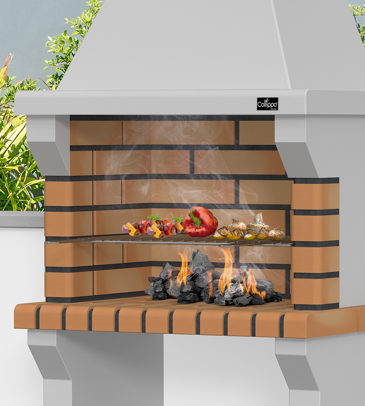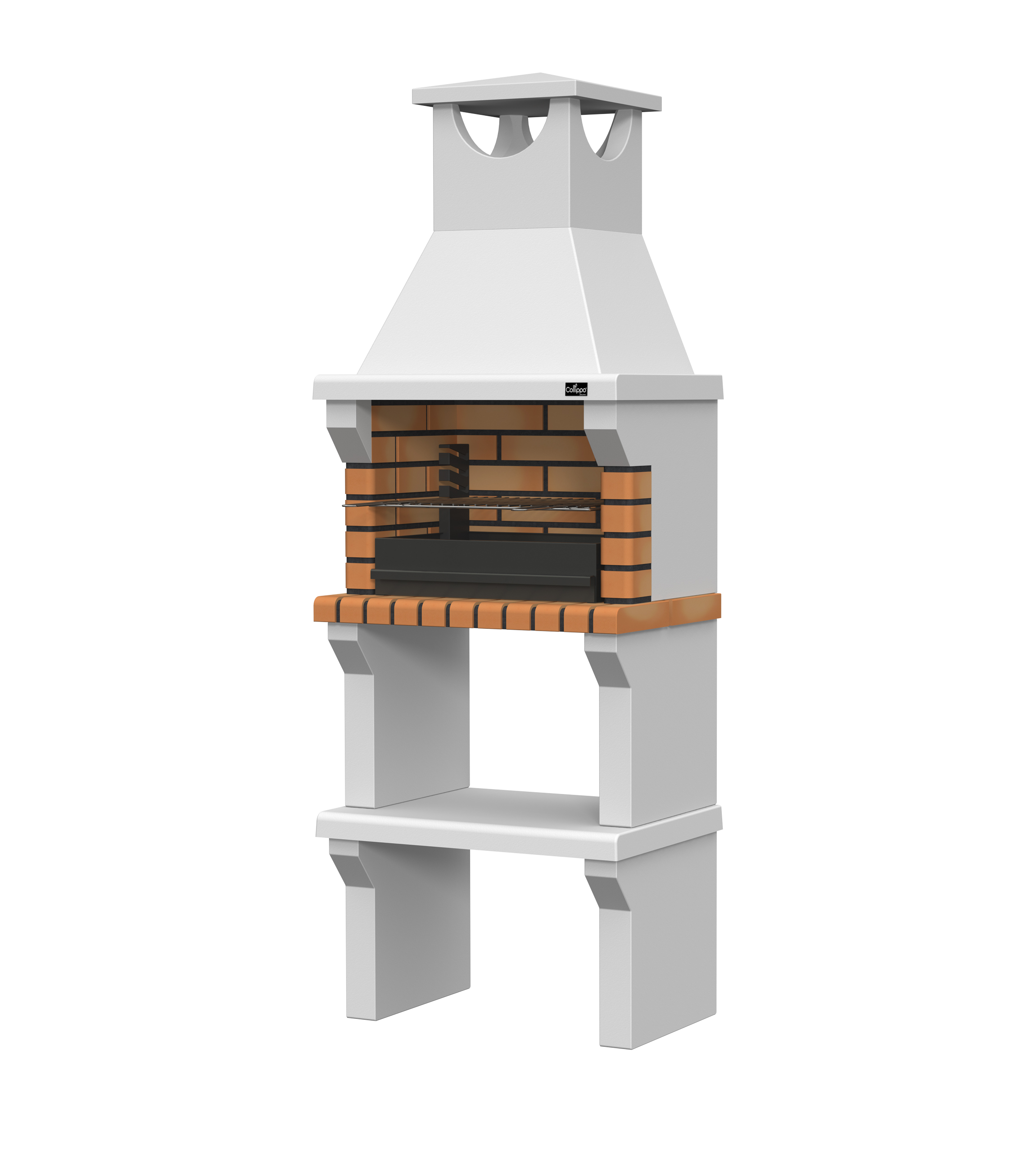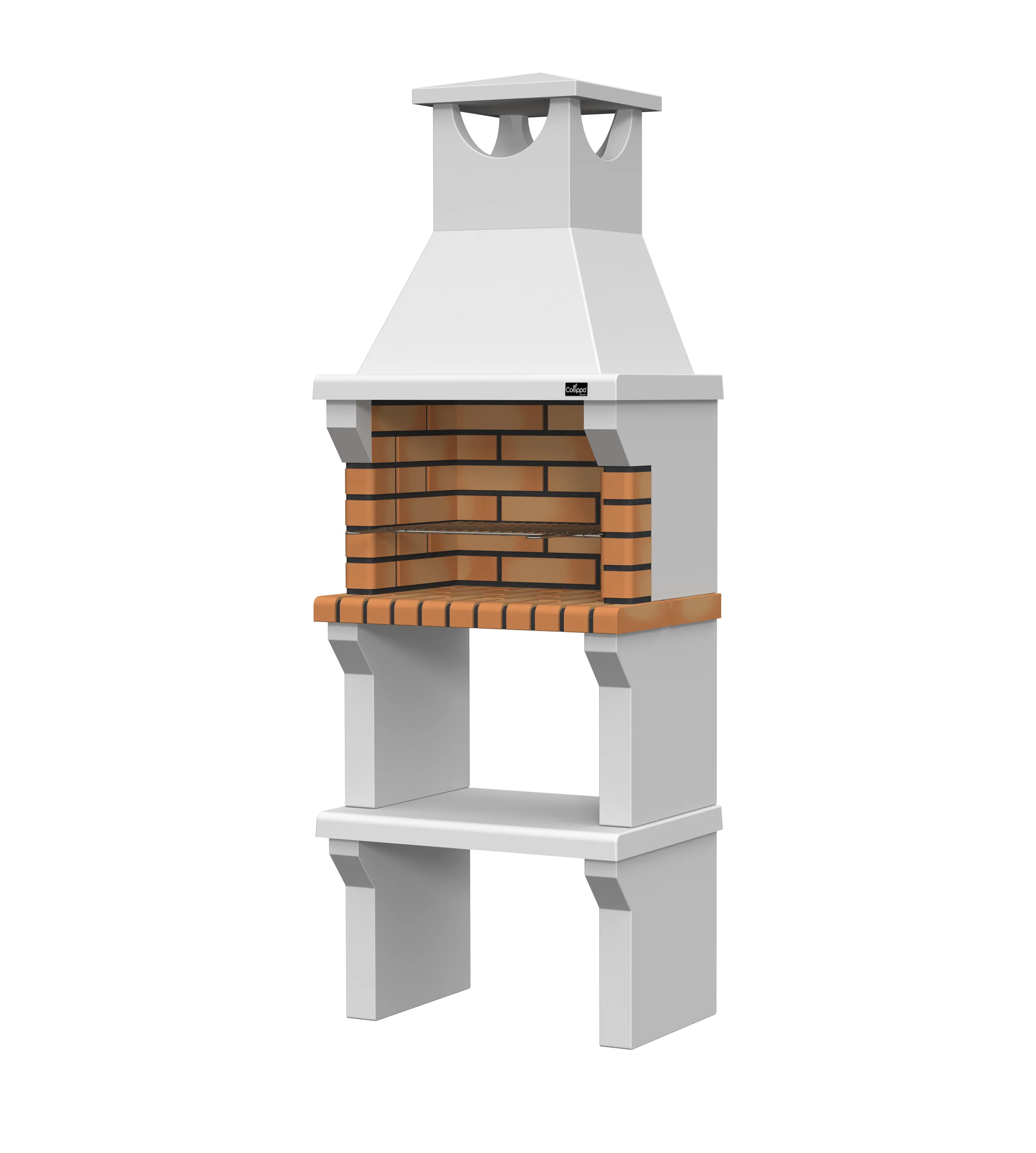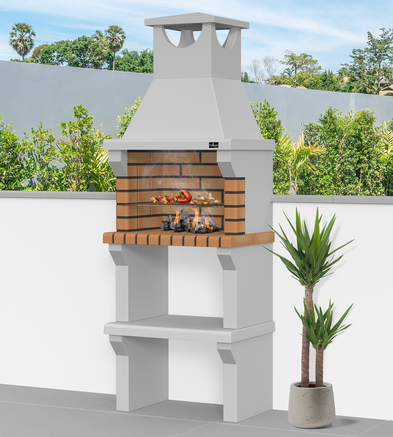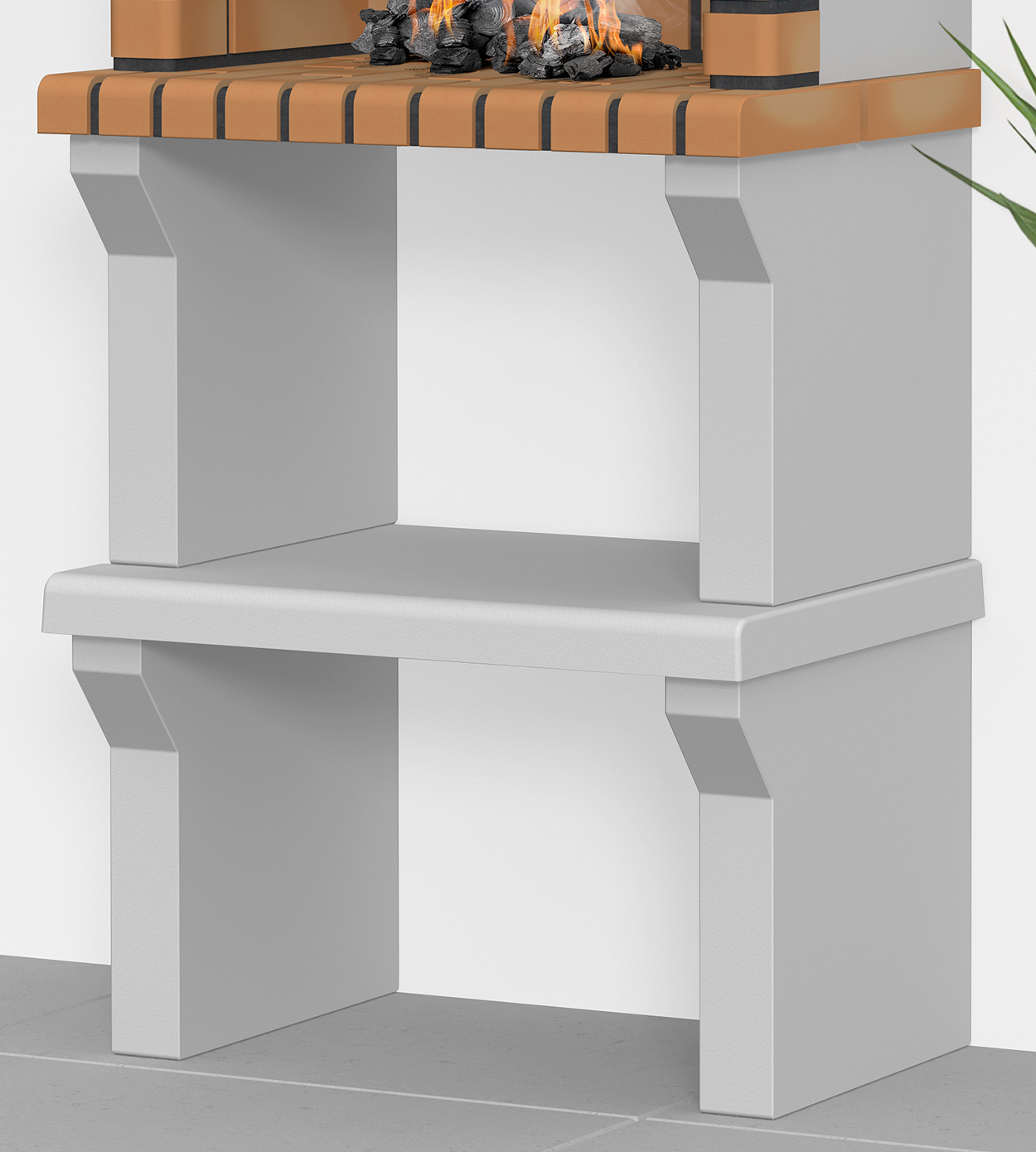 Peças em micro betão cinzento liso e micro betão cinzento texturado; zona de fogo em tijolo e cimento refratário