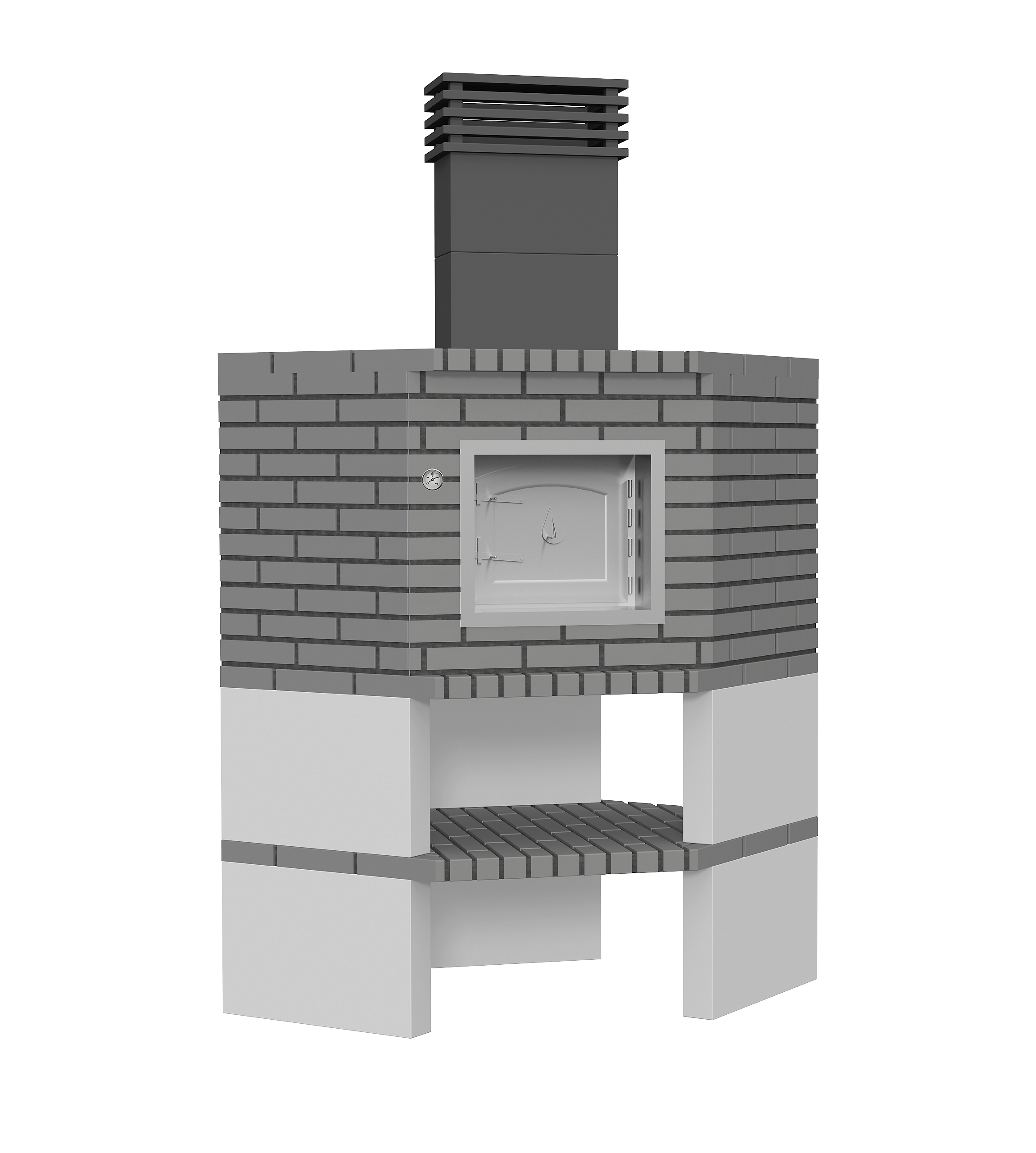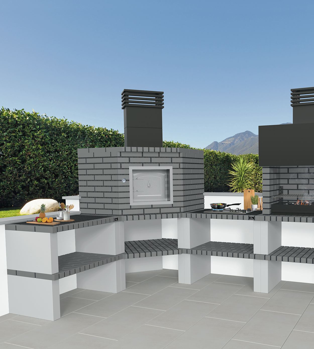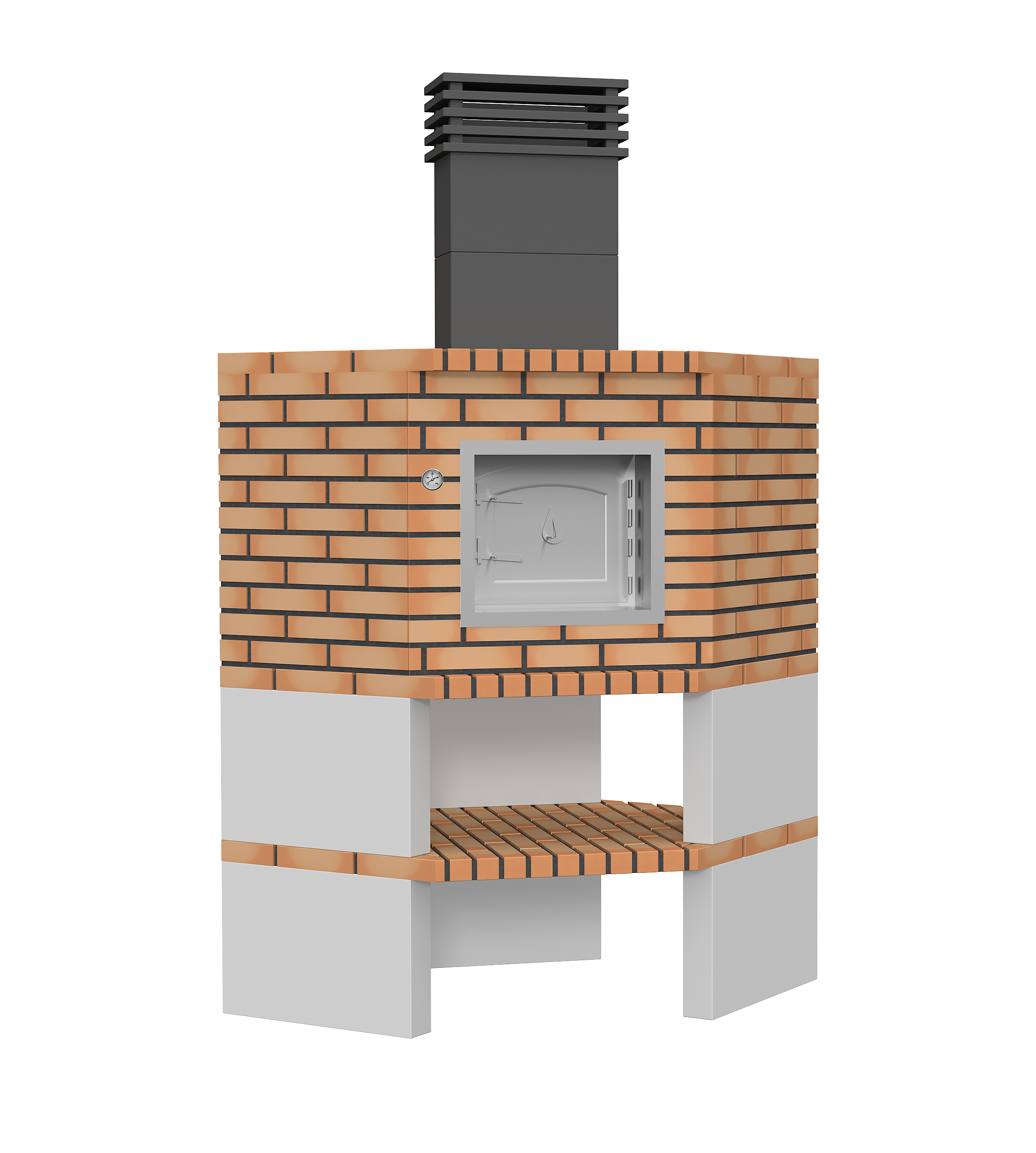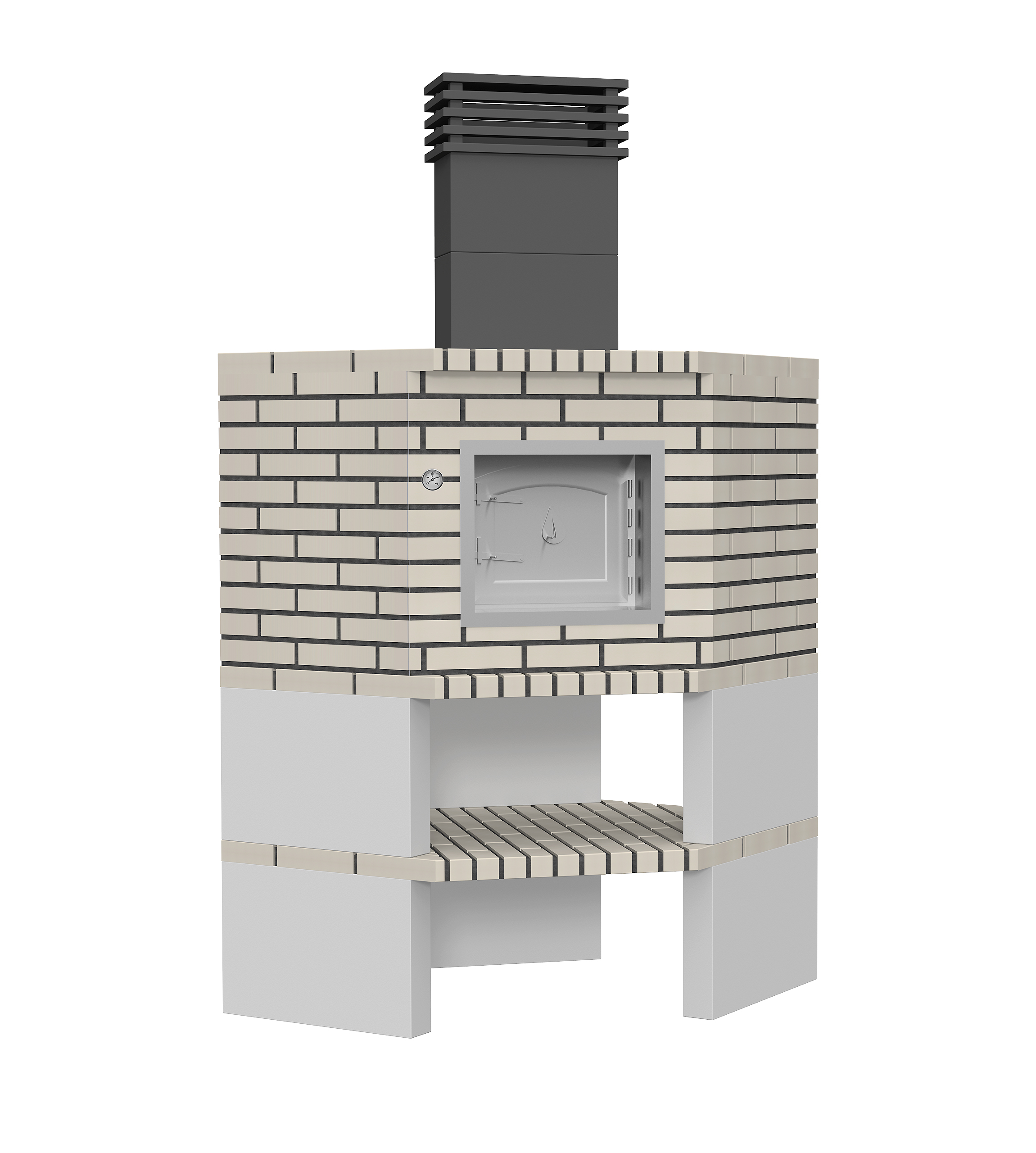Micro betão liso branco; saída de fumos com pintura preta; paredes em tijolo