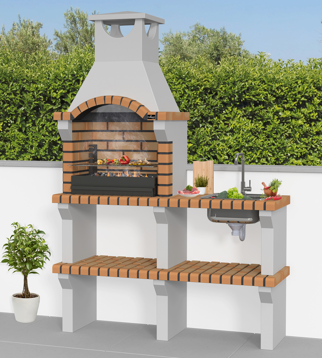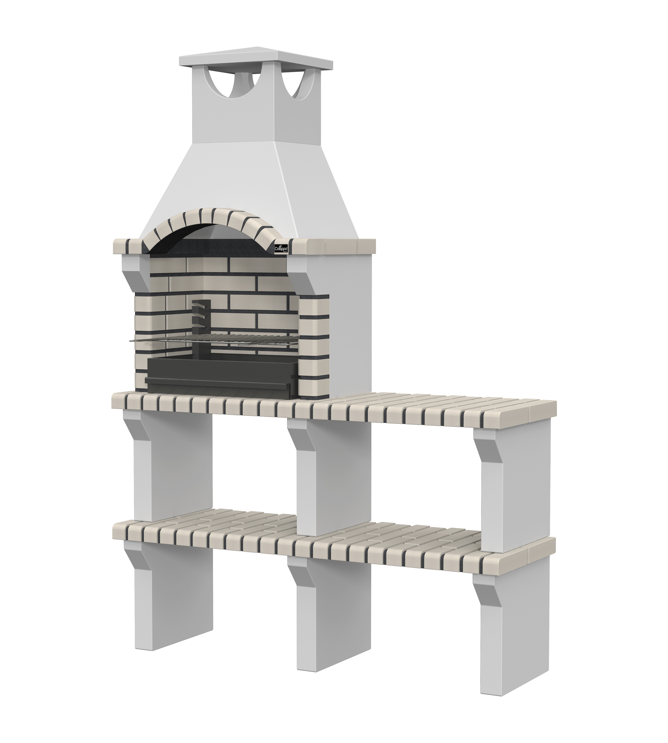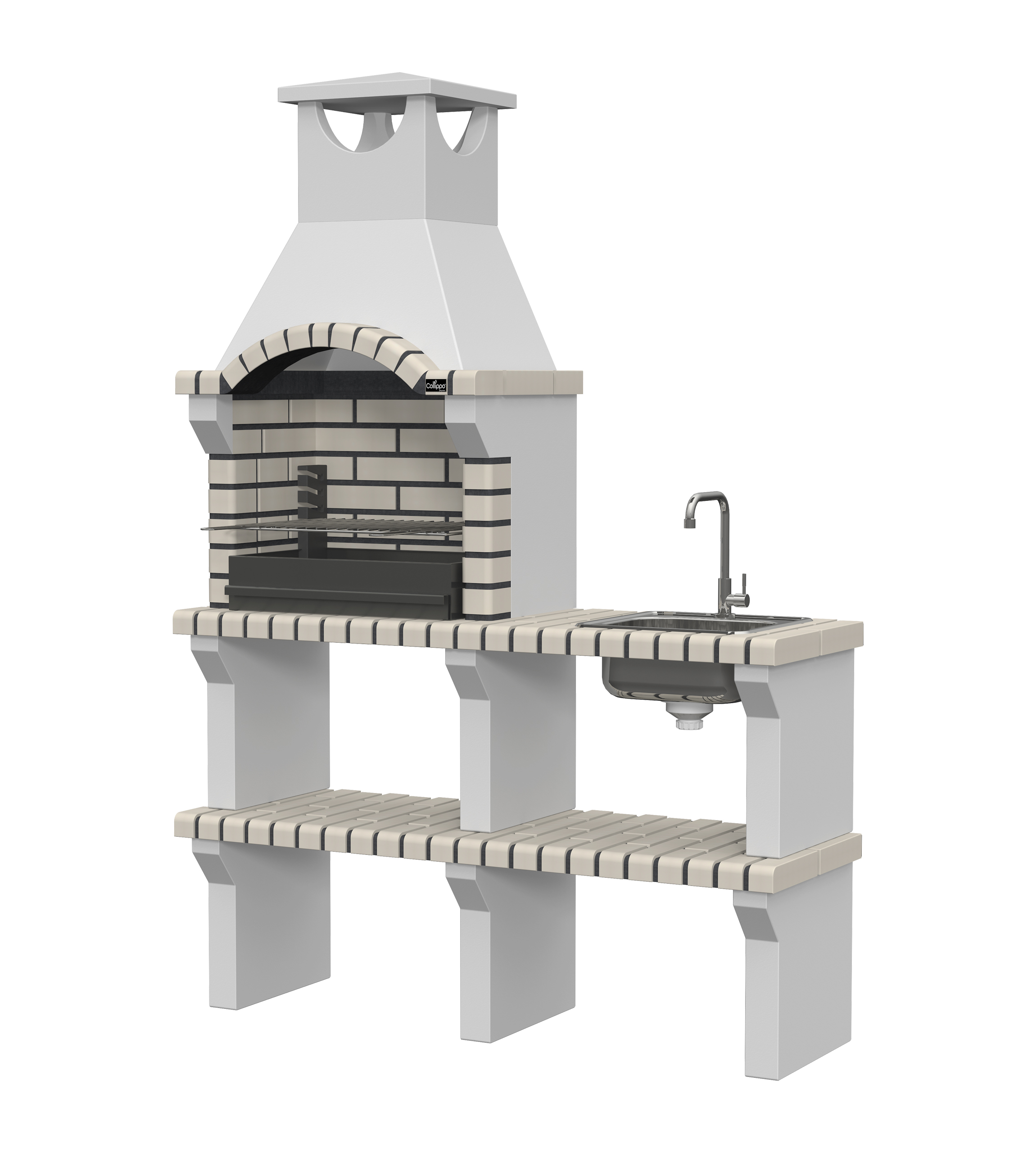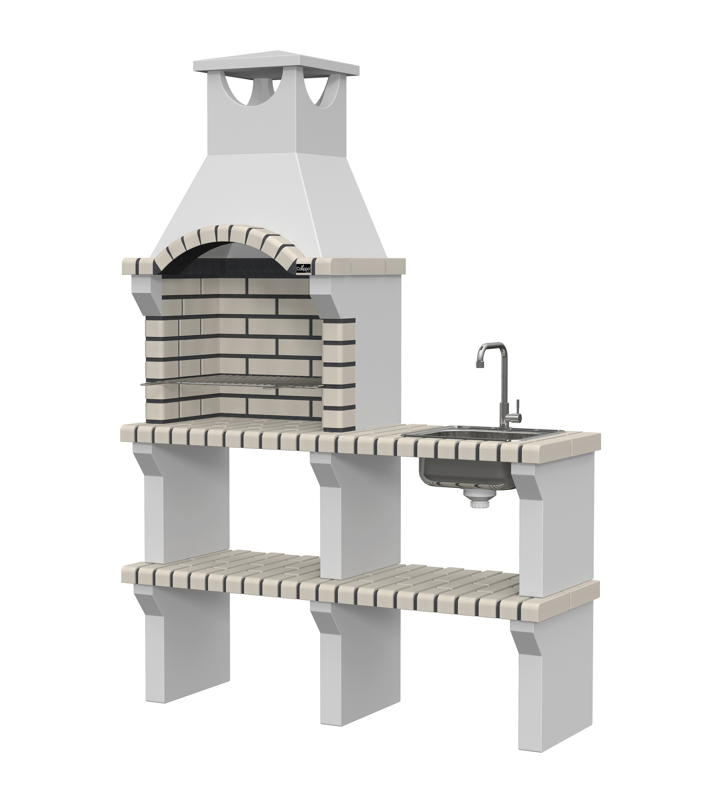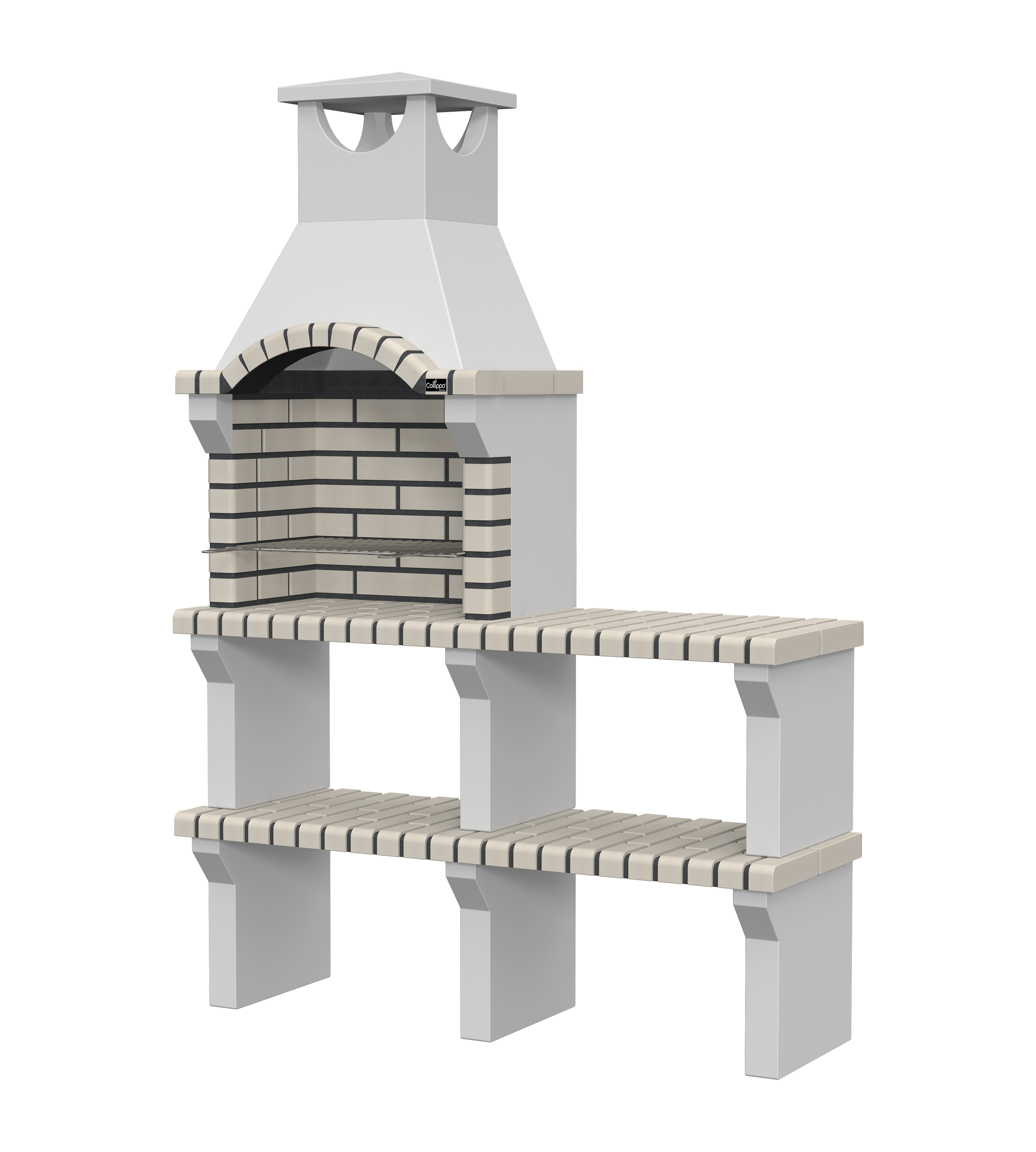 Peças em micro betão cinzento liso e micro betão cinzento texturado; zona de fogo em tijolo e cimento refractário