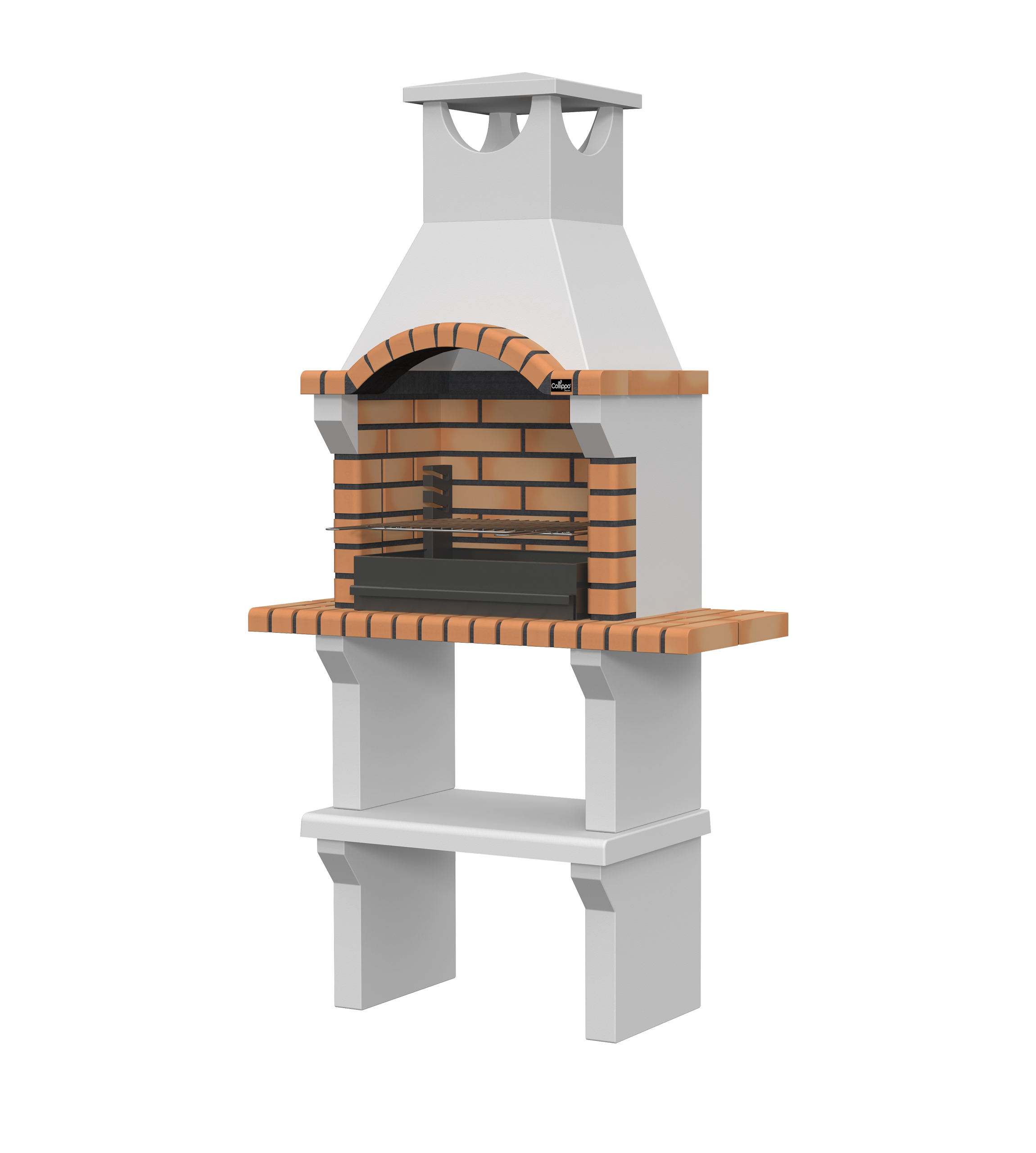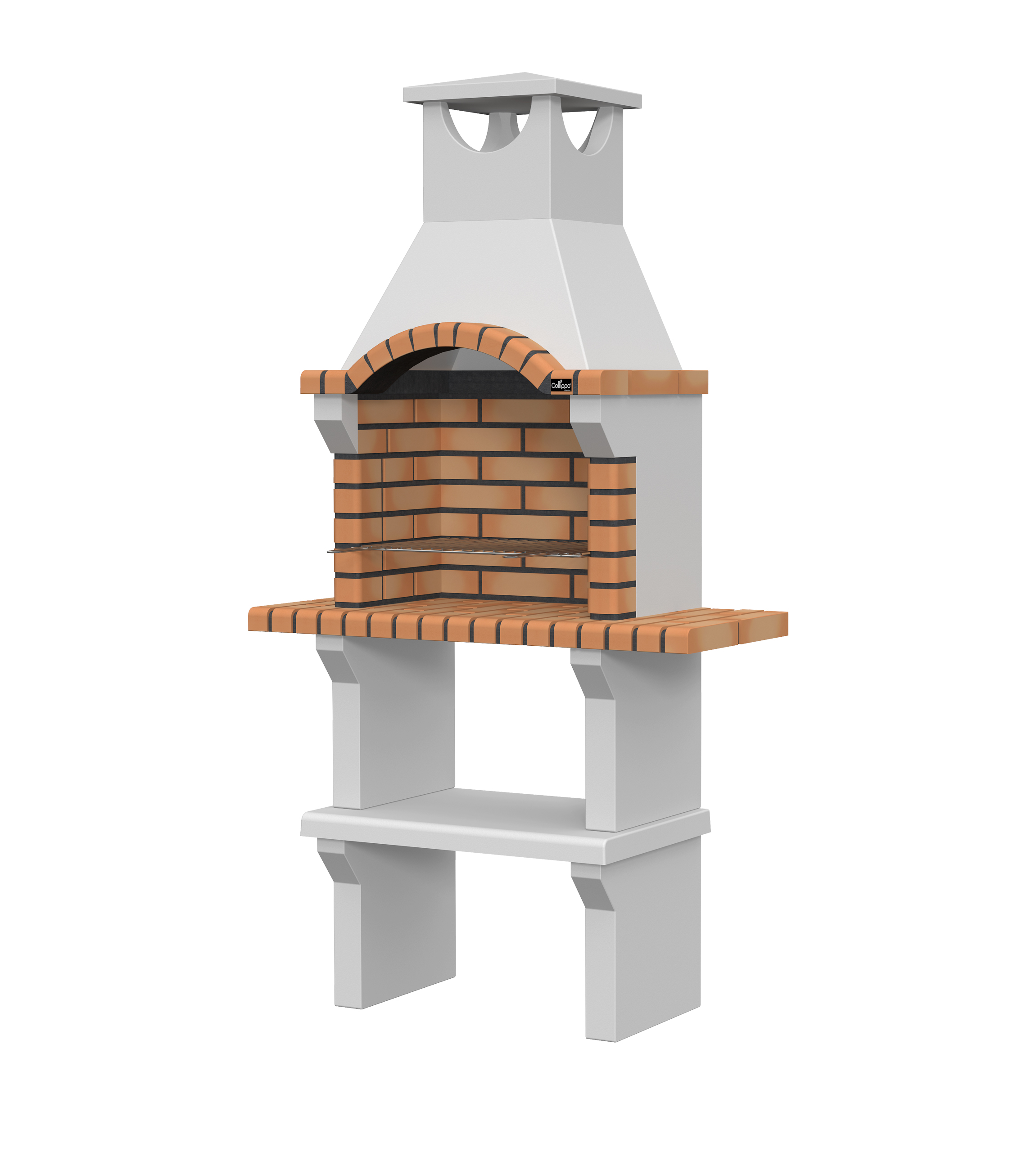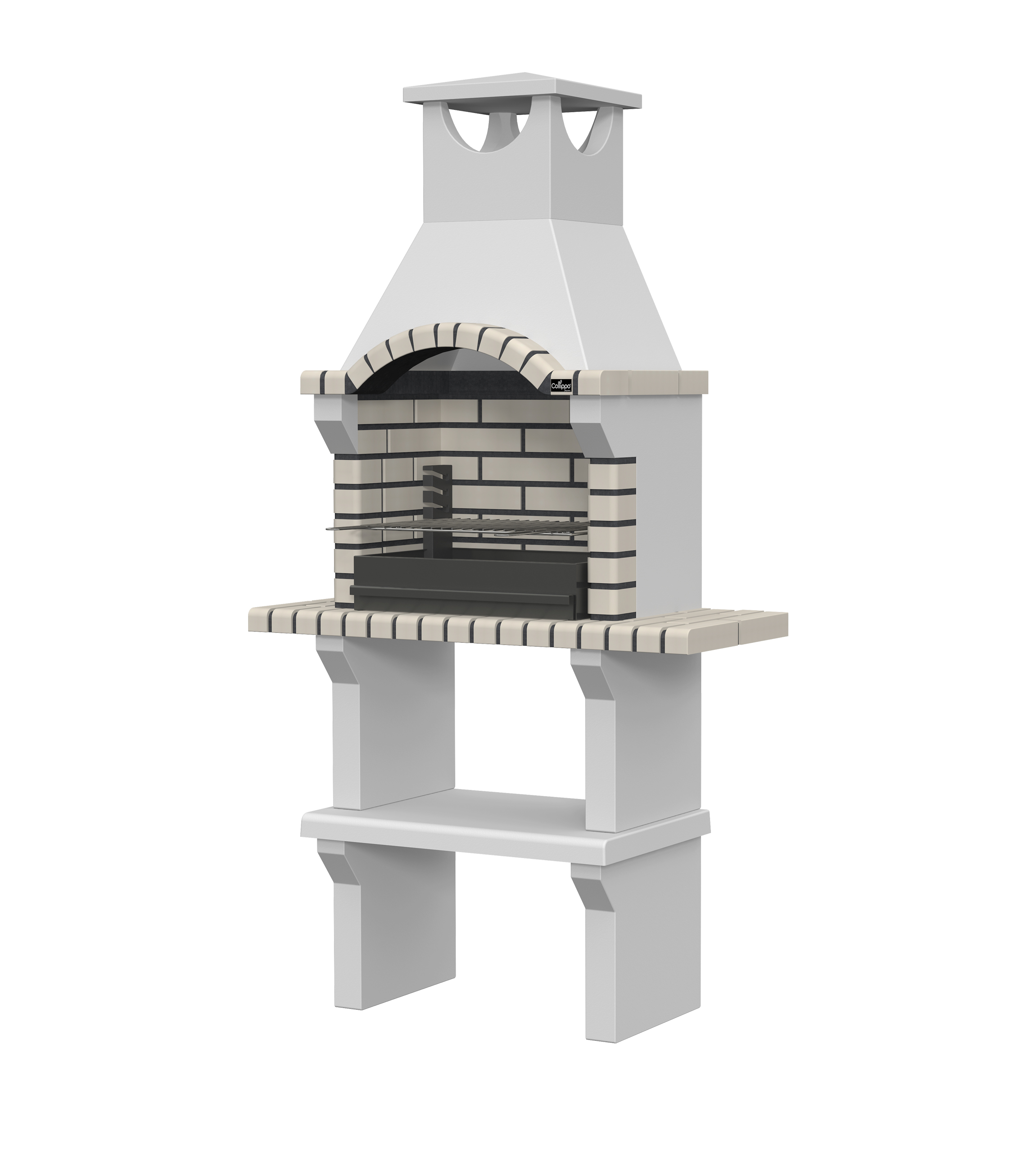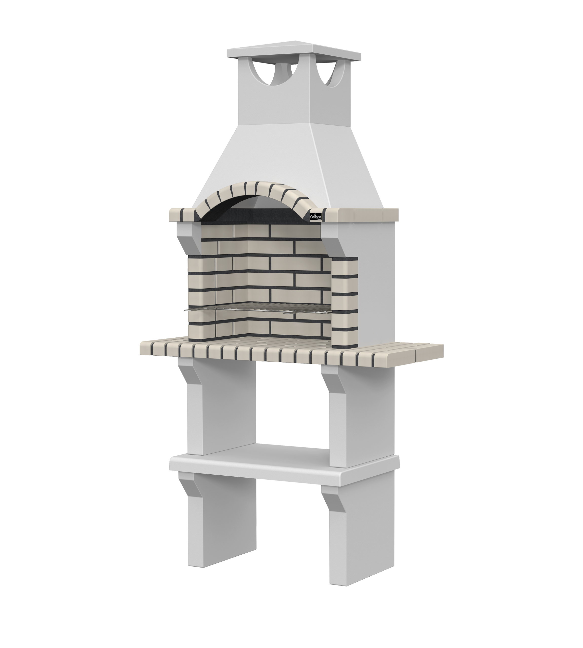 Peças em micro betão cinzento liso e micro betão cinzento texturado; zona de fogo em tijolo e cimento refractário