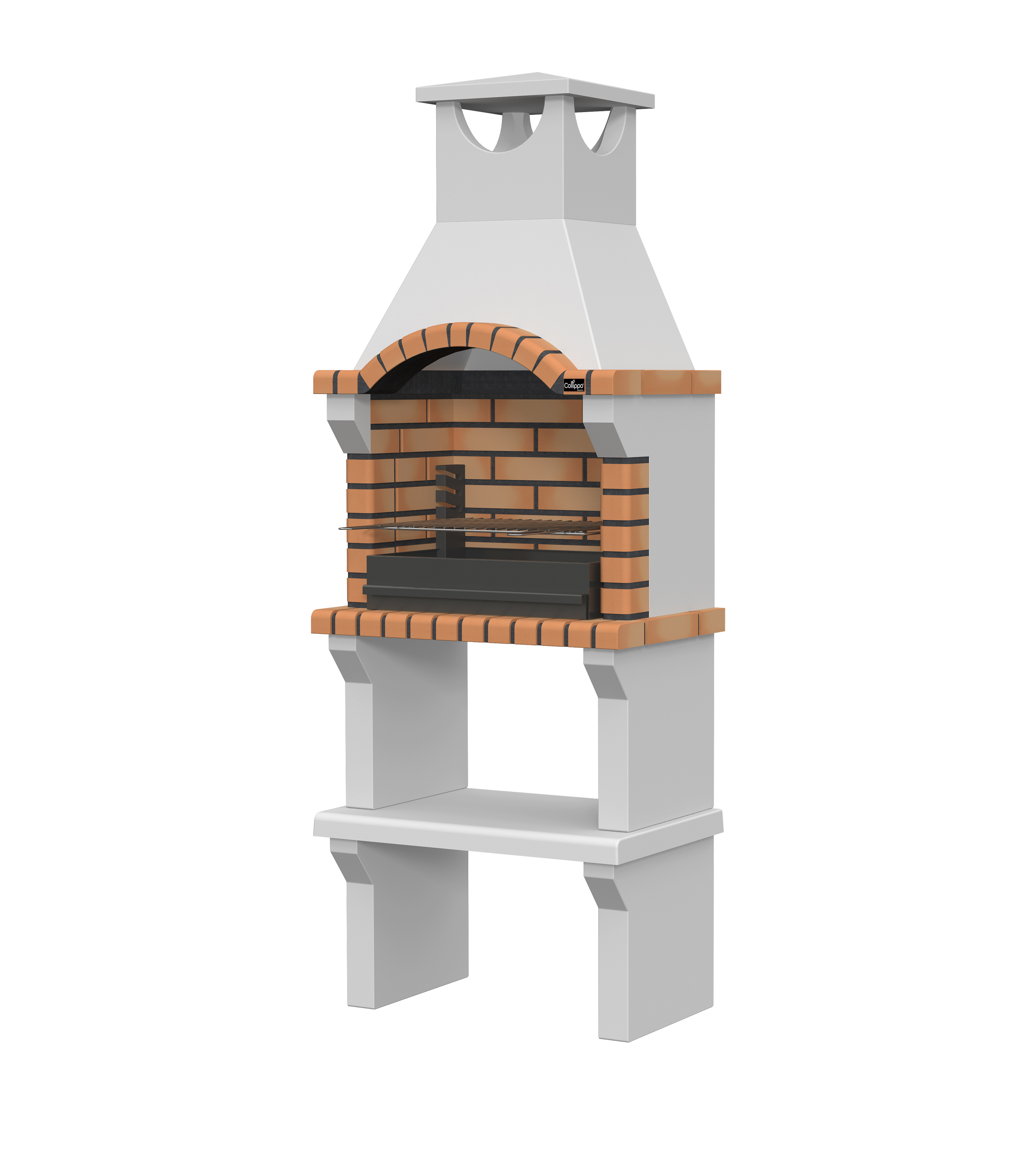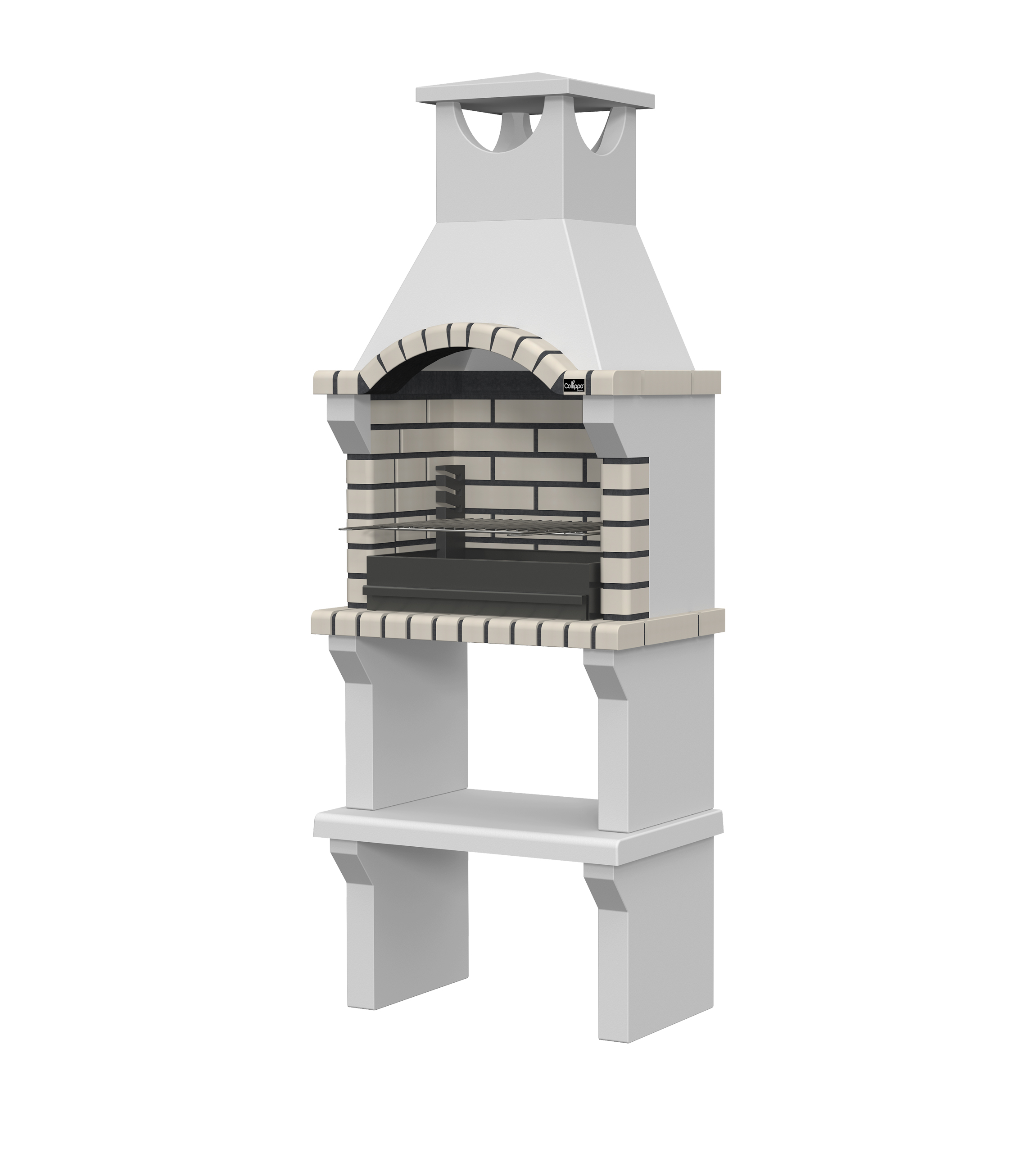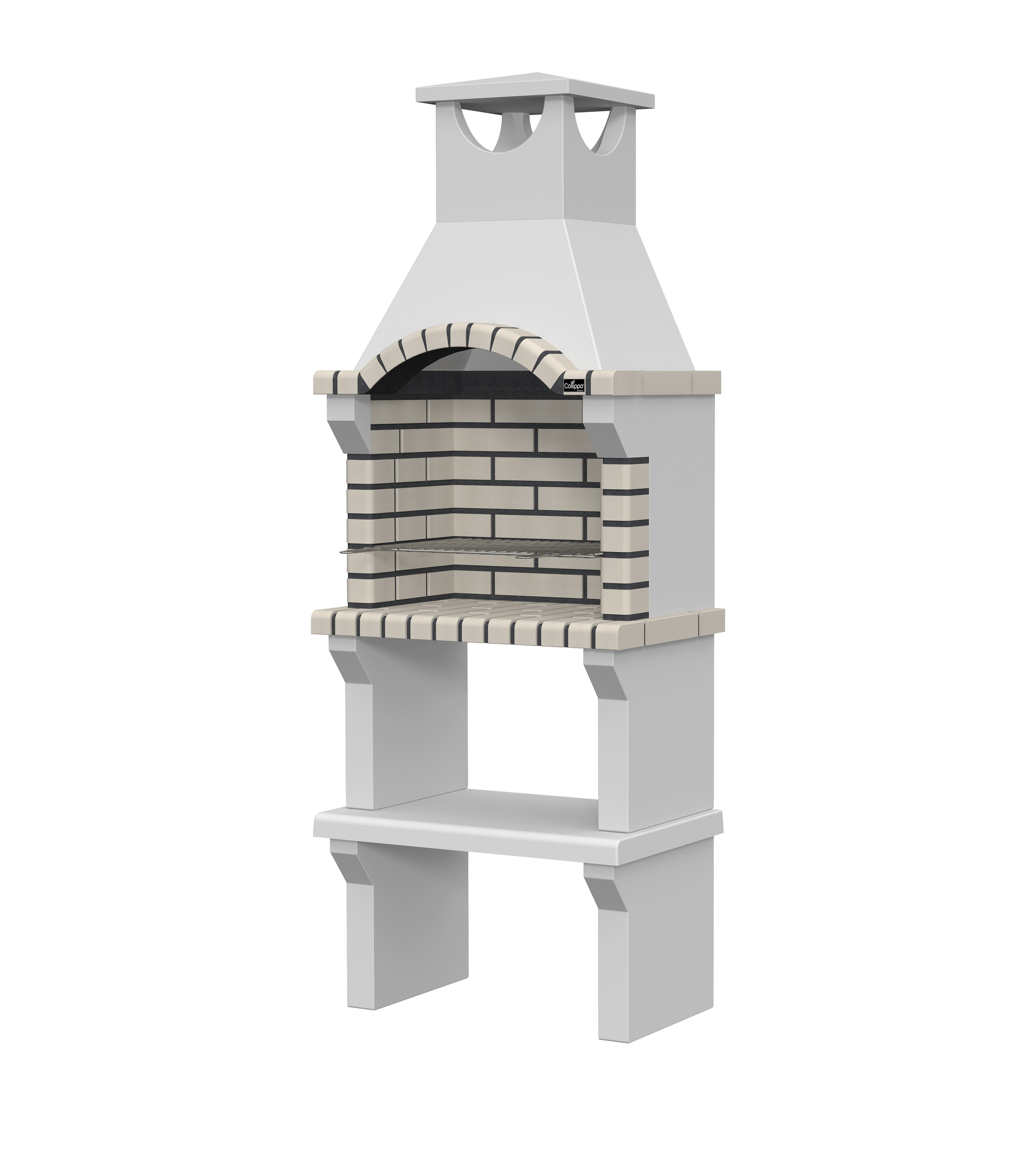 Peças em micro betão cinzento liso e micro betão cinzento texturado; zona de fogo em tijolo e cimento refractário