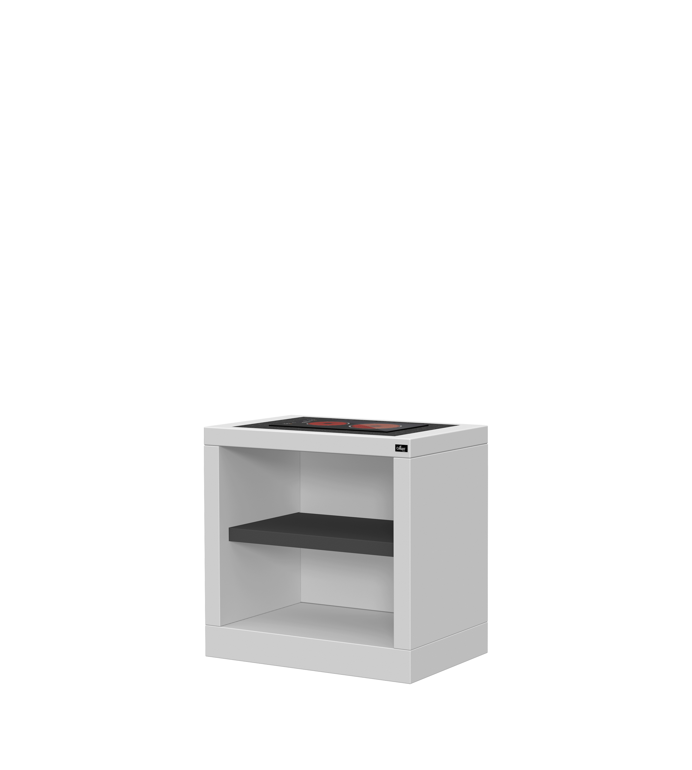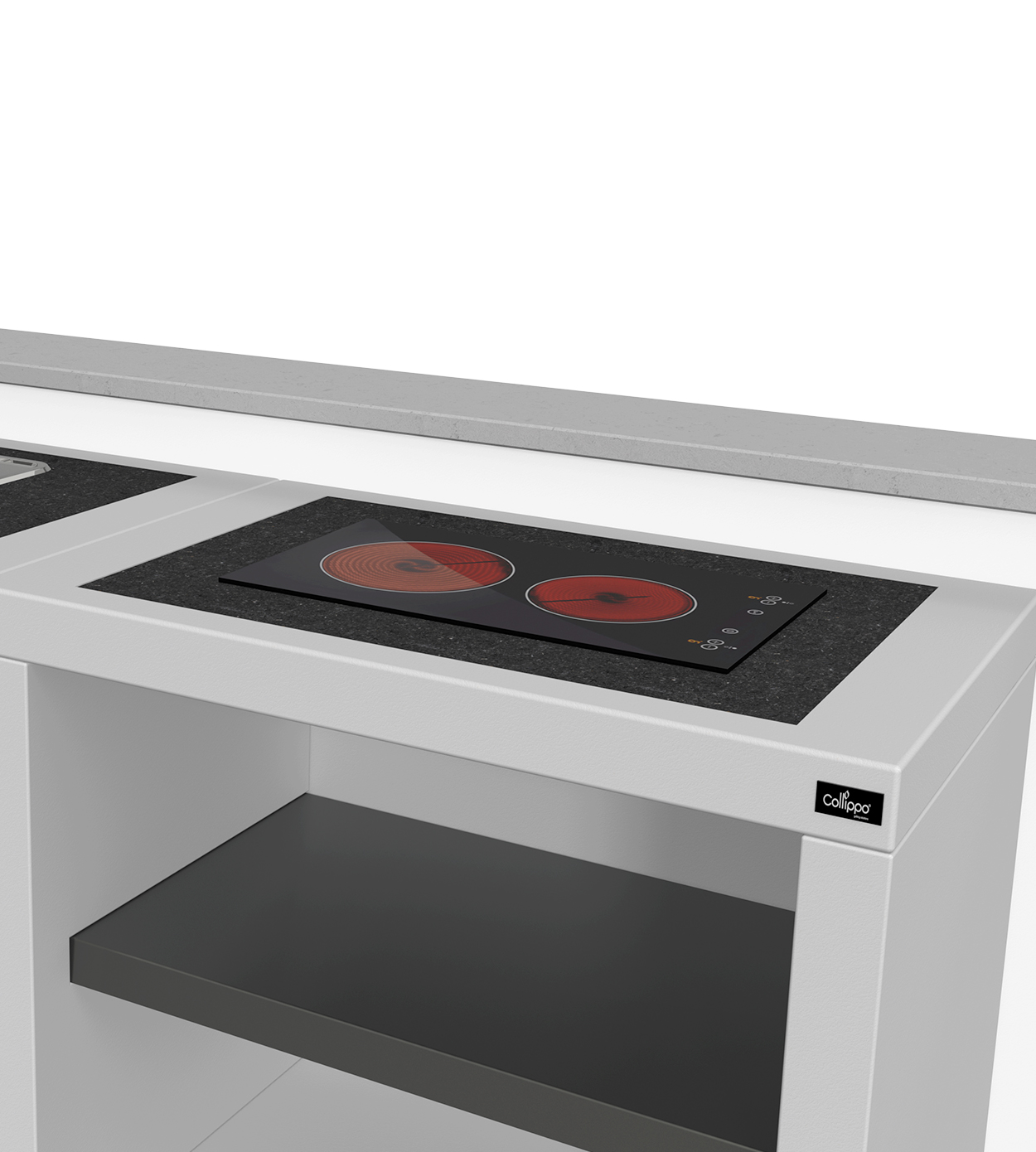Micro betão liso branco; prateleira com pintura preta; bancada em granito com placa eléctrica;