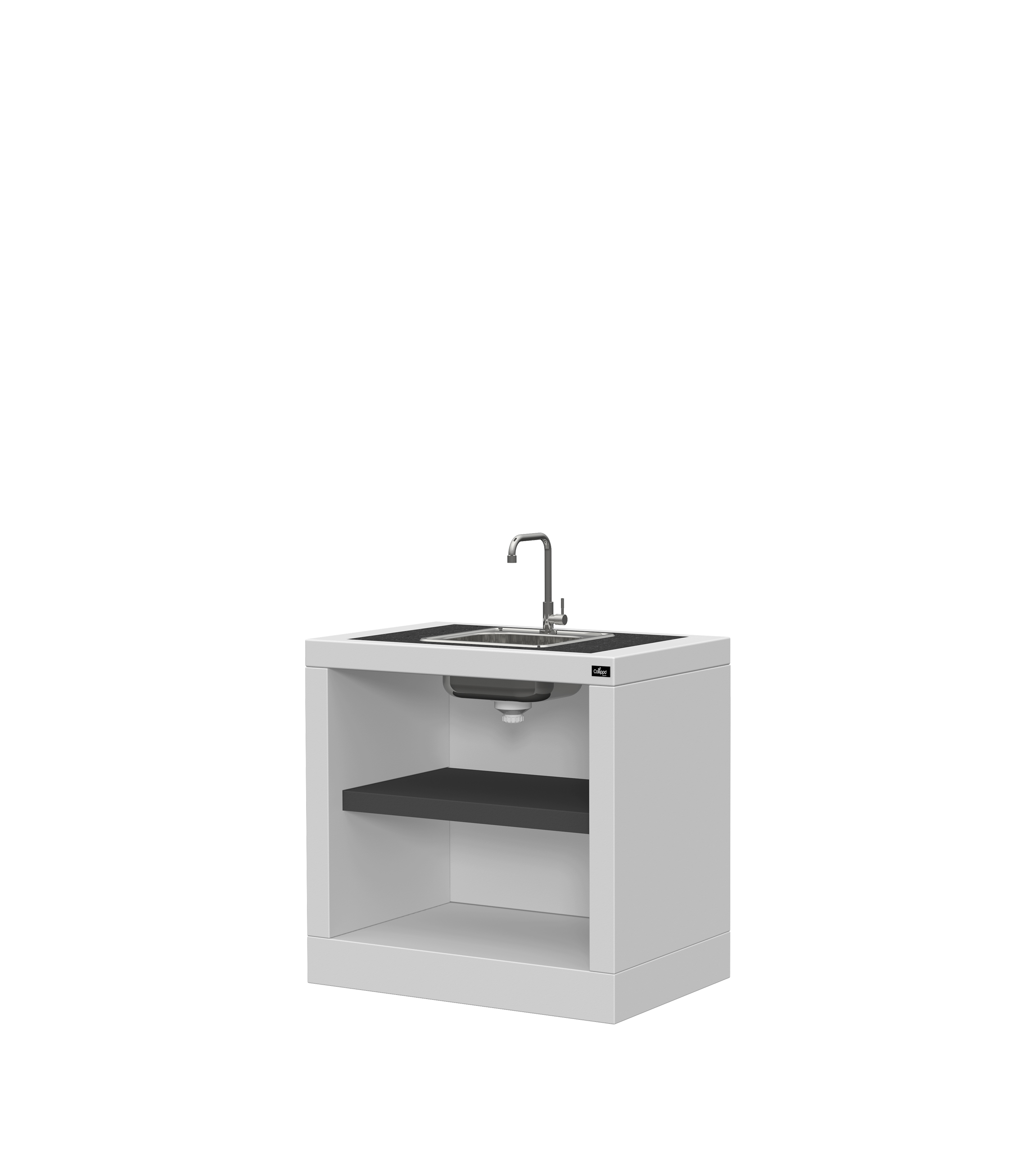 Micro betão liso branco; prateleira com pintura preta; bancada em granito