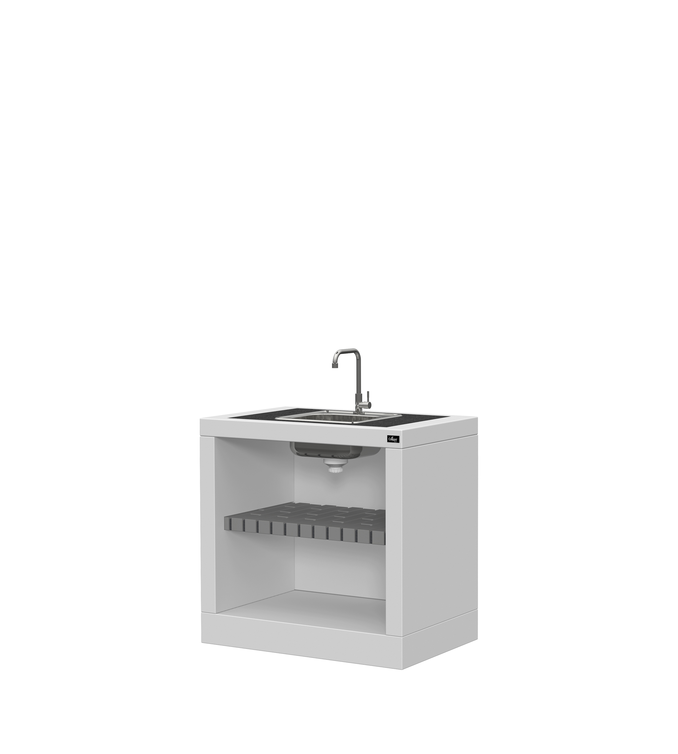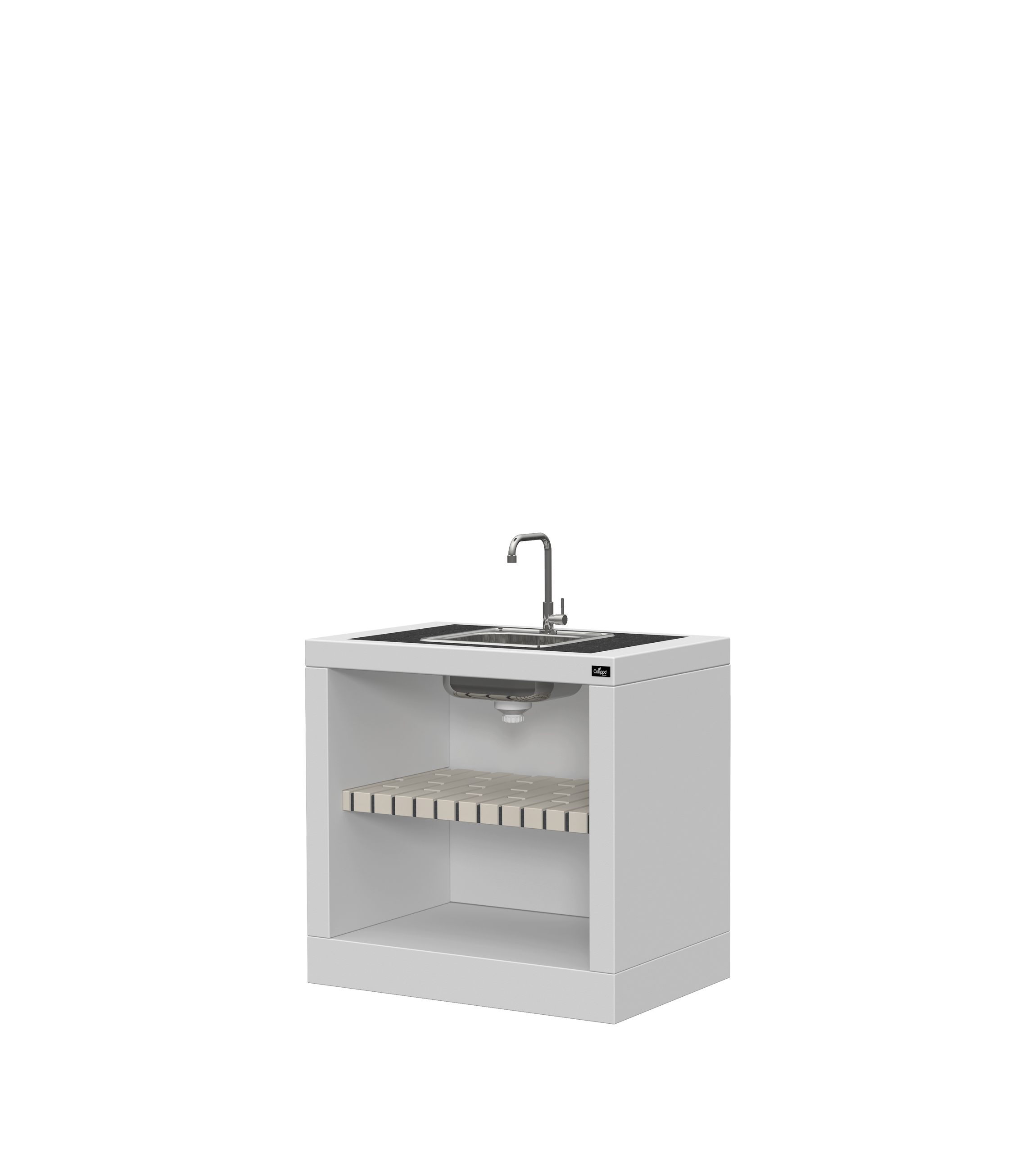 Micro betão liso branco; prateleira em tijolo; bancada em granito